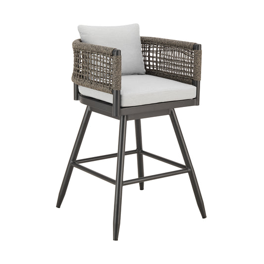 Zella Outdoor Patio Swivel and Counter Stool in Aluminum with Light Gray Rope and Cushions