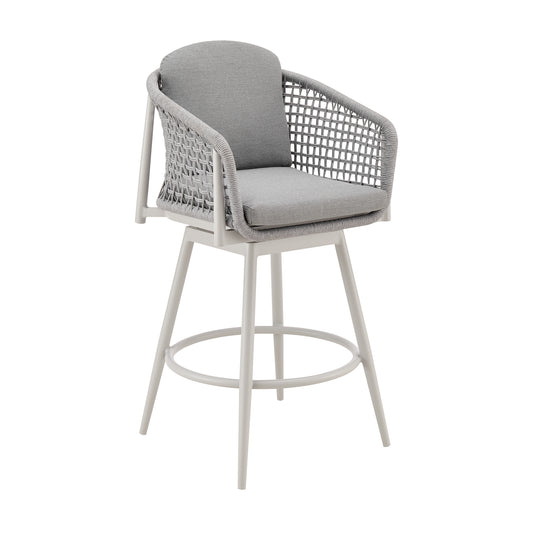 Rhodes Outdoor Patio Swivel Stool in Aluminum with Light Gray Rope and Cushions
