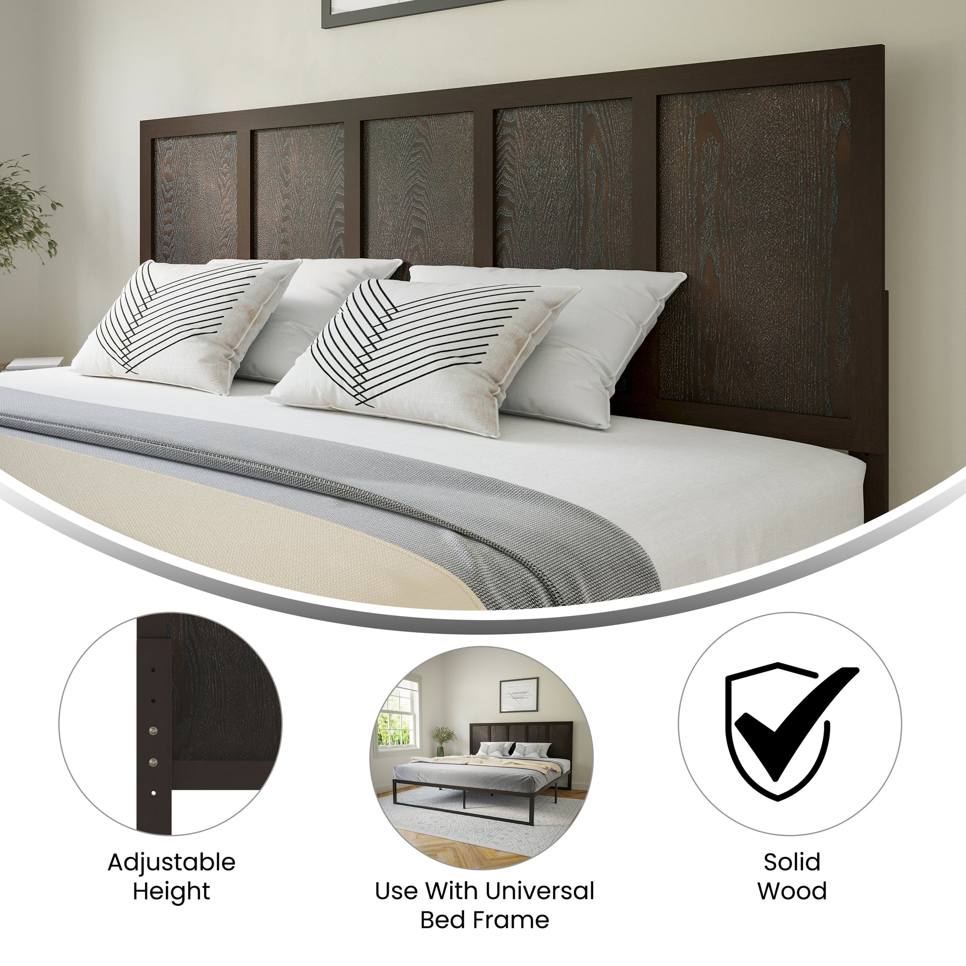 The elegant design features multiple panels that add a touch of sophistication, while the rich finishes enhance the overall aesthetic of your room. With dimensions ranging from 38" to 78.25" in width and adjustable heights between 41" to 51", these headboards cater to different bed sizes, including twin, full, queen, and king, ensuring a perfect fit for your mattress.