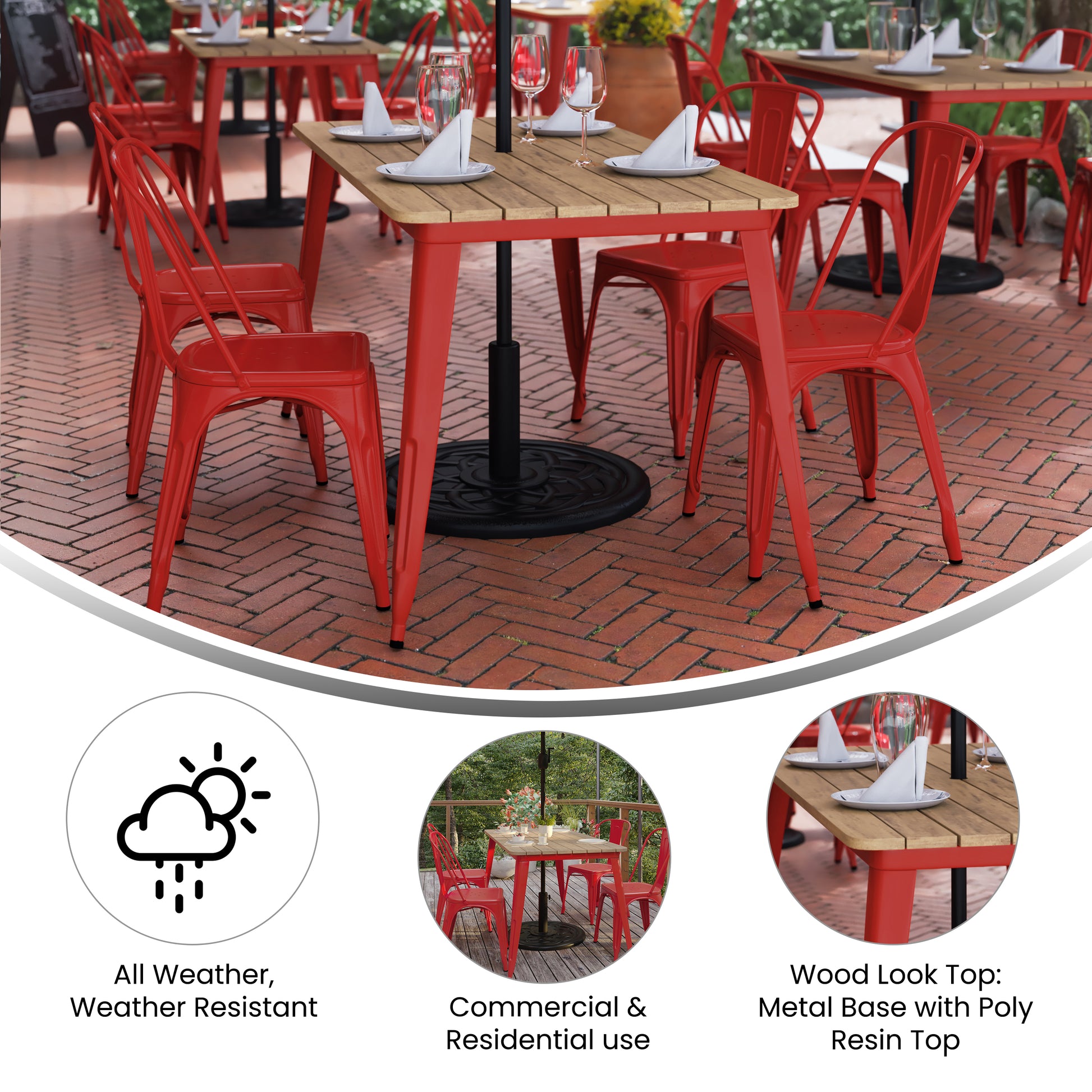 Declan Commercial Indoor/Outdoor Dining Table with Umbrella Hole, 30" x 60" All Weather Brown Poly Resin Top and Red Steel Base Dimensions: 30"W x 60"D x 30"H