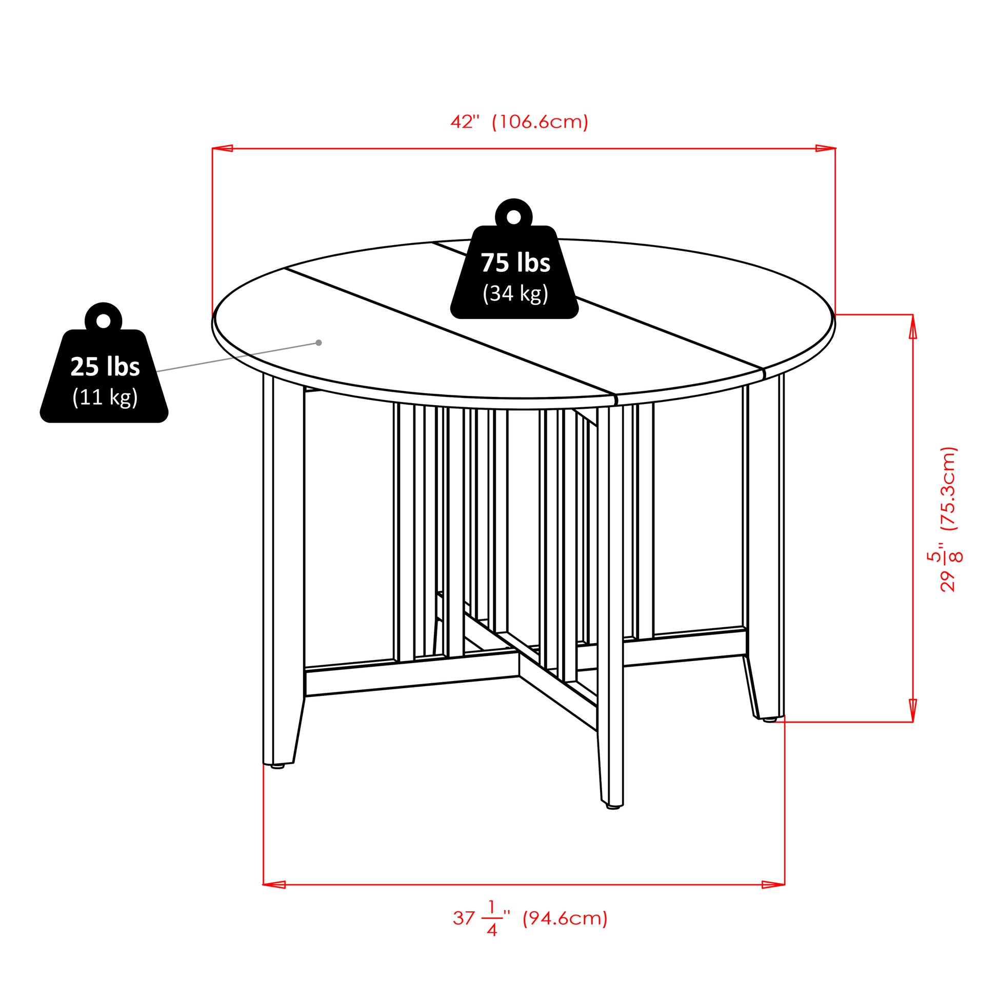 Add Alamo Round Drop Leaf Table and two chairs to your kitchen or sunroom. The round table comes with two drop leaves to accommodate smaller space and fully opens when you have more guests. Fully expand at 42" round and stands at 29.50" Tall. Each Drop leaf is 42"Wide by 14.87" Deep. Table opens with one leaf up is 42"W x 27.80" x 29.65"H. For storage, this table folds down to 41.97"W x 13.84"D x 29.65"H. Construction with combination of solid and composite wood. The set comes with 2 Ladder Back Chairs stands at 16.60"W x 20.50"D x 34.70"H. Seat height from ground is 18" and Seat back has 16.60"W x 16.69"H. Chairs are made from solid wood in warm walnut finish. Table and Chairs required assembly.Dimensions : 41.97 in. Wide 41.97 in. Deep 29.65 in. High