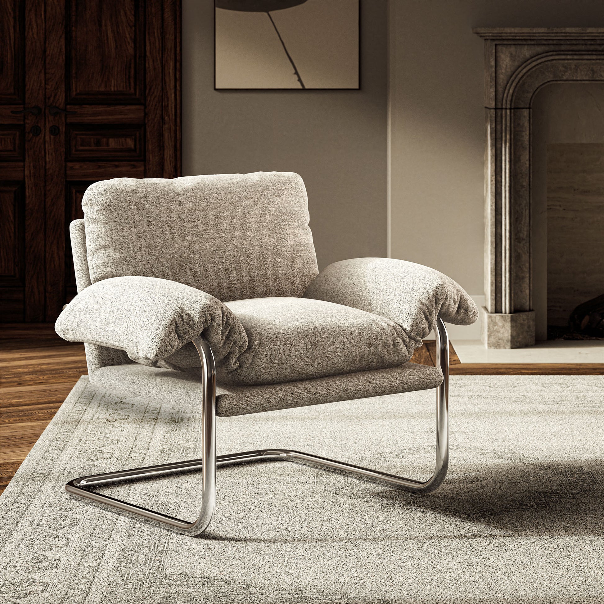 Sink into comfort with this Vintage Accent Armchair, an inviting statement piece perfect for your living room, bedroom, or lounge area. This modern retro armchair features a robust stainless steel cantilever frame, elegantly upholstered in your choice of plush performance velvet or cozy boucle fabric. The fixed back and seat provide a stable, lightly padded base, while a comfortable back cushion and a thick body cushion that drapes over the arms add an extra touch of flair.