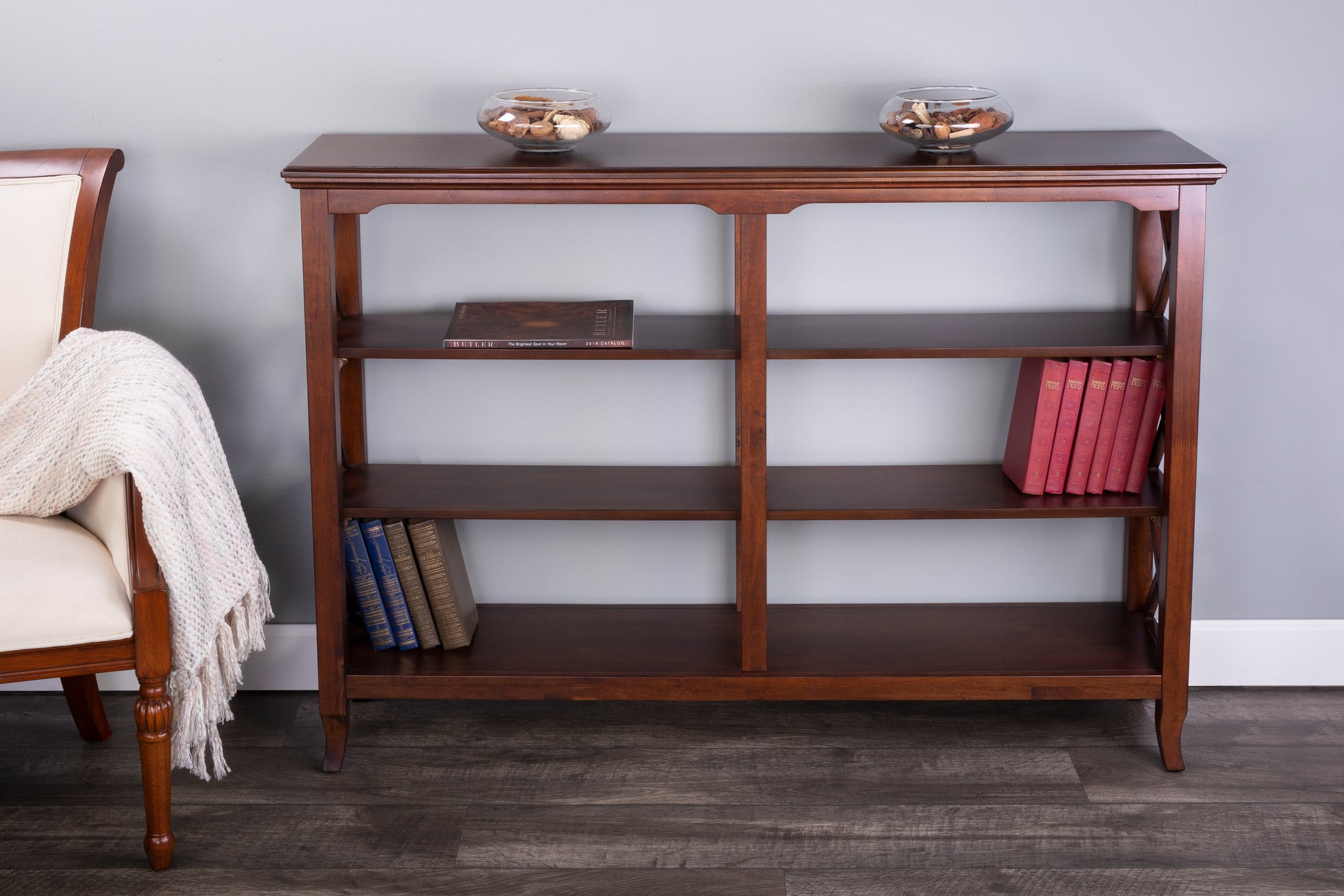 Appolinar 6 Shelves 32"W Bookcase in Medium Brown 5497024 This elegant bookcase console table is an ideal addition in the living room, dining room, kitchen, or entryway. It features three fixed display shelves for books and magazines and a spacious top for displaying pictures and decorative items. Constructed from rubberWood solids, engineered Wood, and birch veneer, its “X“ side panels and rich cherry finish provide timeless beauty. Eco-friendly rubberWood and engineered Wood construction with birch veneers Three fixed, open display shelves Finished on all sides for placement against a wall or for floating in an open space Partial assembly required: attach legs and shelves with provided hardware Dimensions: 53"W x 13"D x 36.25"H
