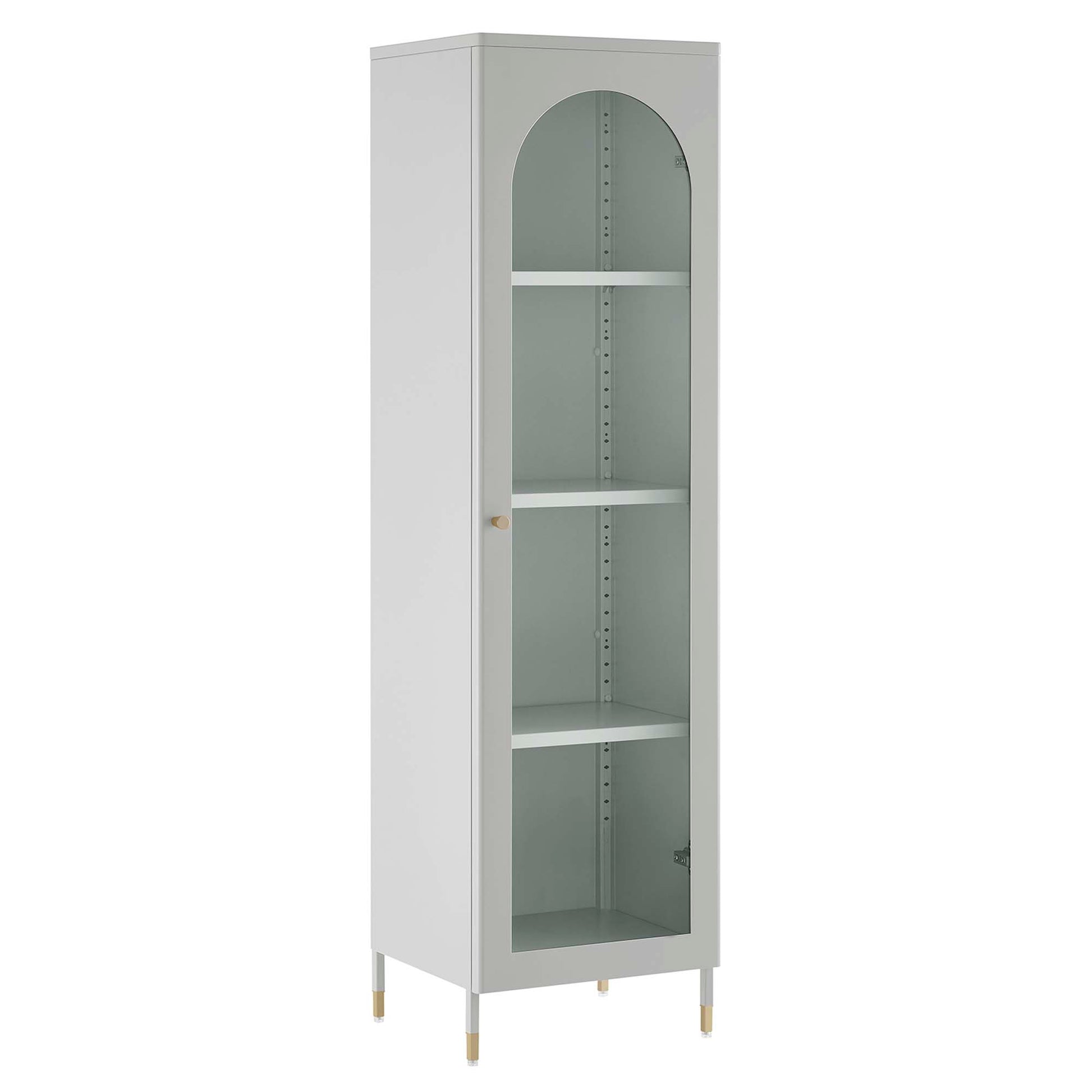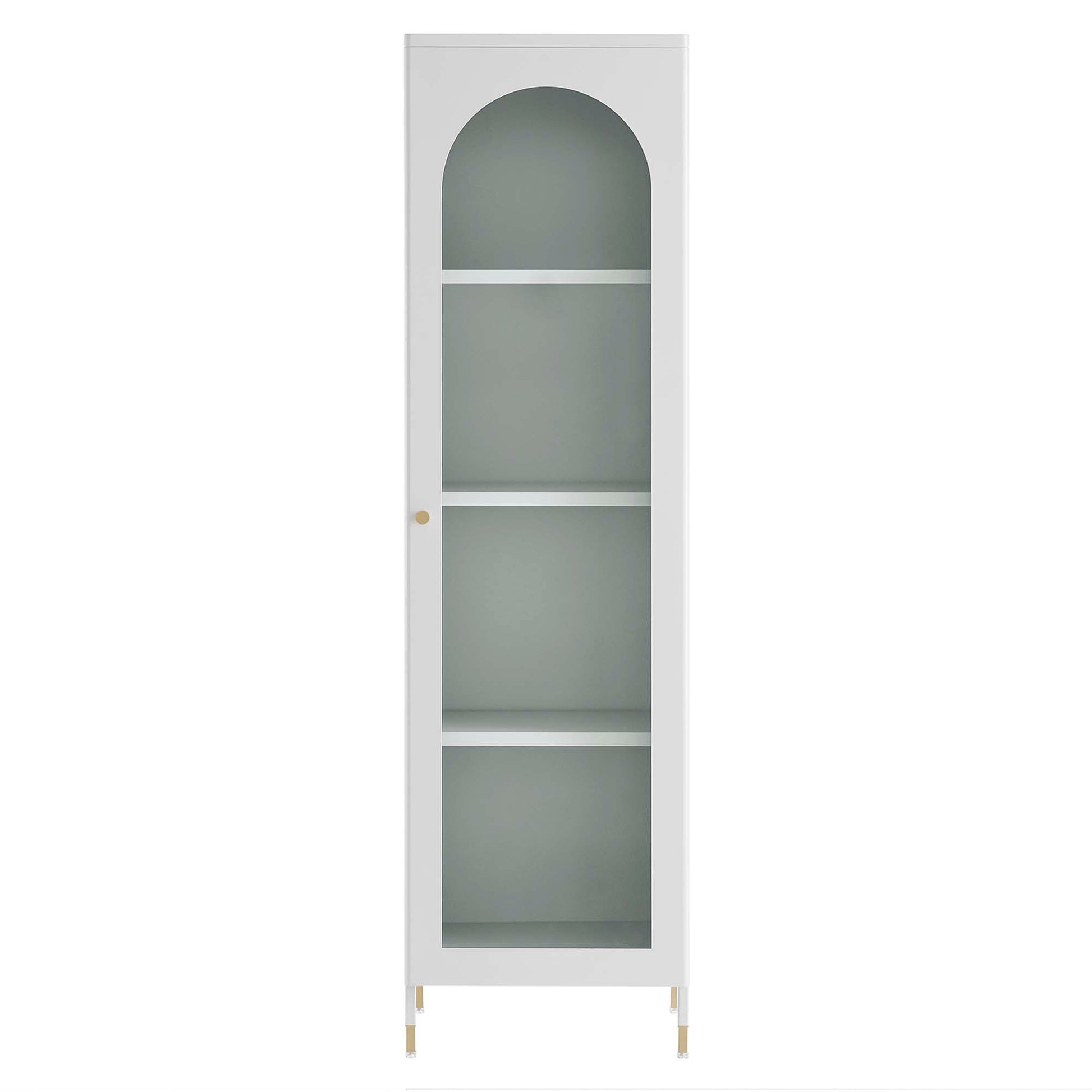 A versatile and stylish soultion, the Archway Tall Storage Cabinet offers room for both storage and display. Crafted from powder-coated cold-rolled steel plates, this storage cabinet offers durability and modern appeal. The cabinet features three height-adjustable shelves, a glass-front door with arched detail, and a copper-plated zinc alloy handle pull. With a multi-functional design, this storage cabinet is versatile in usage making it perfect for a variety of areas such as the living room, home office, entryway, dining room, and kitchen. This tall storage cabinet is ideal for organizing linens, office supplies, books, collectibles, home decor, and more. Equipped with adjustable foot pads for floor protection and stability, this stylish cabinet includes anti-tipping hardware for enhanced safety. Upgrade your storage options with Archway. Assembly required. Overall Product Dimensions: 14"L x 15.5"W x 56.5"H