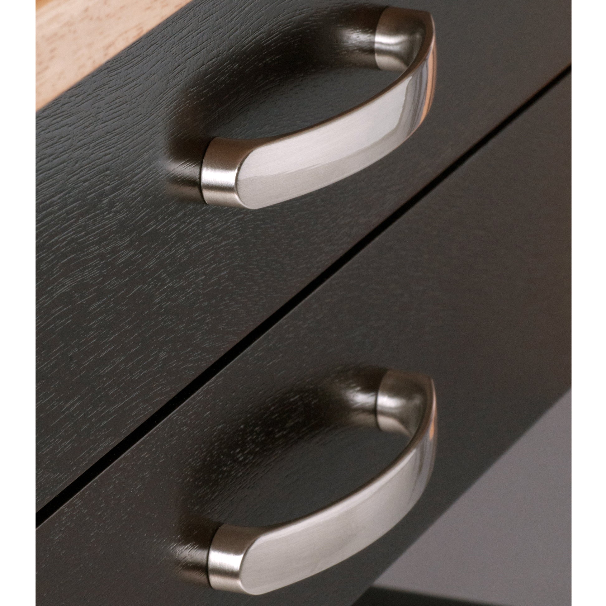 Add a contemporary touch and the richness of two-toned wood to your kitchen with the Winsome Wood Bellini Kitchen Utility Cart. The natural wood top brings a lovely contrast to the darker coffee-finished cabinet and is sure to stand out. Packed with features, and adds a functional extra storage and prep area in your kitchen. Extend the drop-leaf top for extra workspace or to create a dining table for two. This cart is a must have for small spaces that need versatility. Plenty of room to store all your cooking essentials. With two wide drawers with modern, brushed silver handles that provide maximum space for silverware, knives, and accessories. Keep dishes, glassware, or your favorite cookbooks within reach on the open shelf. The enclosed cabinet offers additional storage space for serve ware, canisters or kitchen towels. Keep the cart in one place or roll it out to the dining room and use as a serving cart when guests are over. Four Rolling casters, two of which lock to keep the unit stable while in use, allow for easily mobility when needing to move or take into another room. Constructed of sturdy solid and composite wood this two-tone kitchen cart will be a great addition to any home. Conveniently packed and shipped in 1 box that includes the hardware necessary for assembling. Replacement parts can be requested directly to the manufacturer within 60 days from date of purchase.