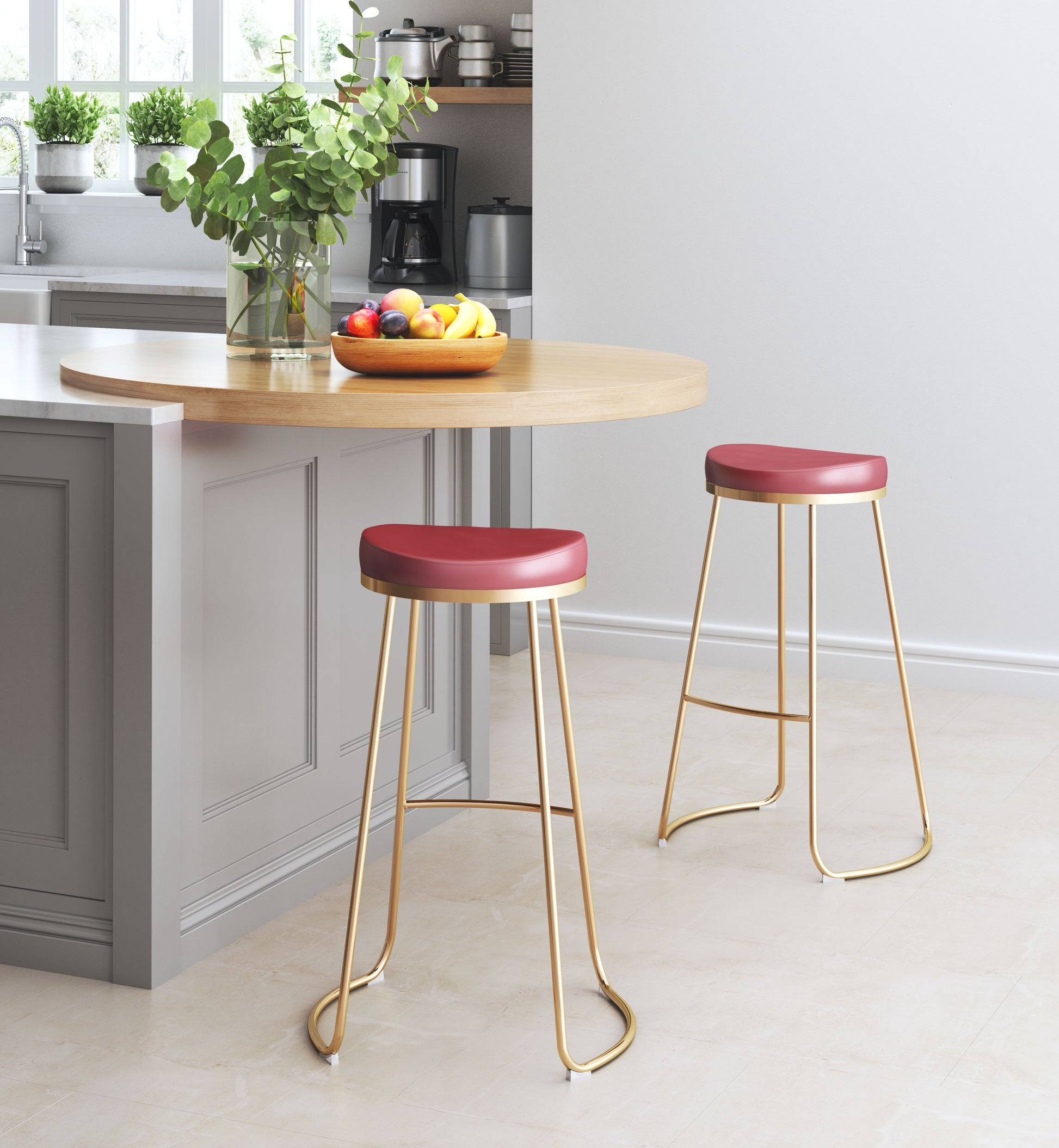 Add glamour to your bar or kitchen area with this simple and sophisticated barstool. Lux gold legs in solid Stainless Steel bend subtly to support a simple round faux leather seat in burgundy red. Its fluid modern design will compliment in any decor. Wonderfully comfortable with a generous padded cushion and footrest. Protective plastic feet keep your floors scratch-free.