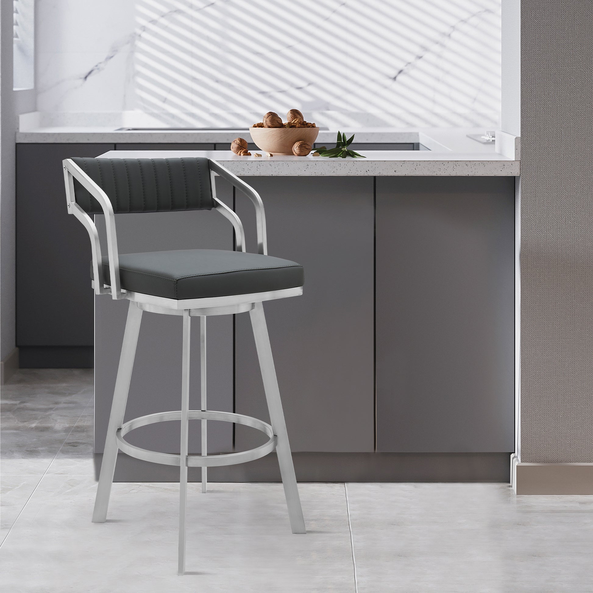 Add a modern touch to your home with this stylish swivel bar and counter height stool. Designed to spark conversations at gatherings, this stool features a unique low arm design that allows you to sit comfortably close to your kitchen island, counter, peninsula, bar, or pub table. Its modern silhouette is enhanced by channel style stitching on the back, while the open-lower back design promotes cool, breathable seating.
