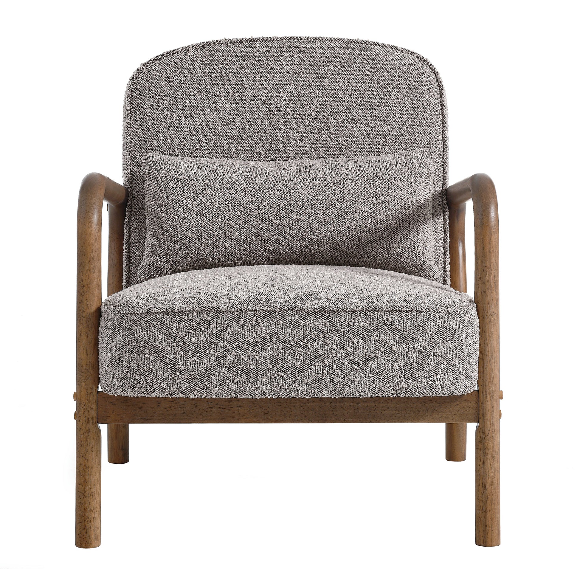 Experience the perfect blend of comfort and timeless style with the Charlie Boucle Chair, a piece of living room furniture that merges mid-century modern elegance with contemporary allure. Crafted with a solid wood frame and dense foam padding on the seat and backrest, this boucle upholstered armchair offers a luxurious seating experience that makes it an irresistible addition to any living room or cozy reading nook. The rounded armrests enhance its aesthetic appeal and also provide extra comfort, making it the perfect modern accent chair for relaxing. Complete with a matching throw pillow for added support, this boucle armchair is not just a comfy reading chair —it's a statement of style. Ideal for those seeking a mid-century modern accent chair, the Charlie Living Room Chair enriches any space with its textured boucle upholstery and curved wooden armrests. Includes felt pads to protect flooring. Assembly required. Weight Capacity: 330 lbs. Overall Product Dimensions: 32.7"L x 26"W x 30.5"H