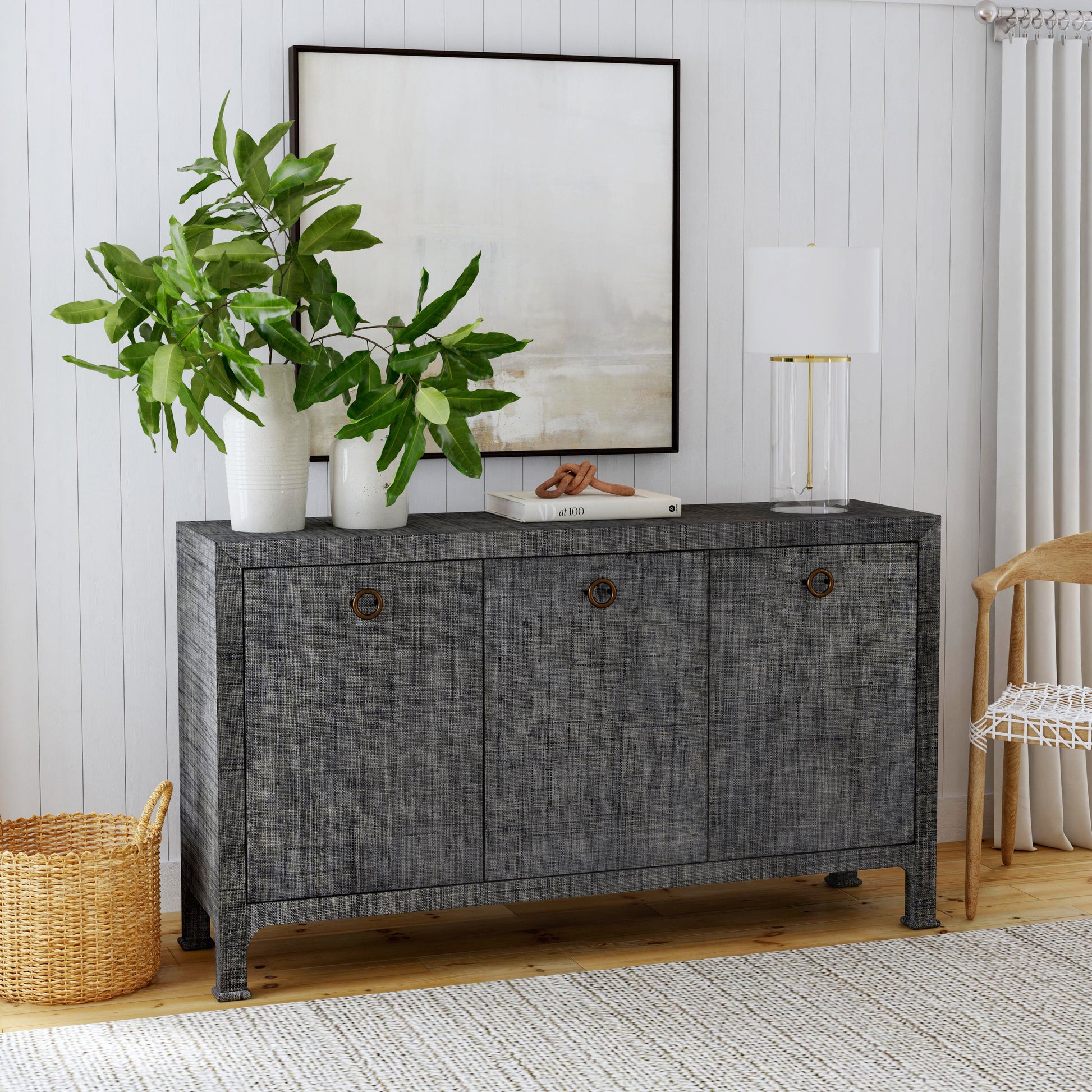 This gorgeous sideboard is beautifully crafted and topped with a layer of woven raffia for a look that feels both tactile and chic. Its three doors open to an adjustable shelf and the doors are outfitted with ring-shaped brass pulls. Dimensions: 60"W x 16"D x 34.5"H
