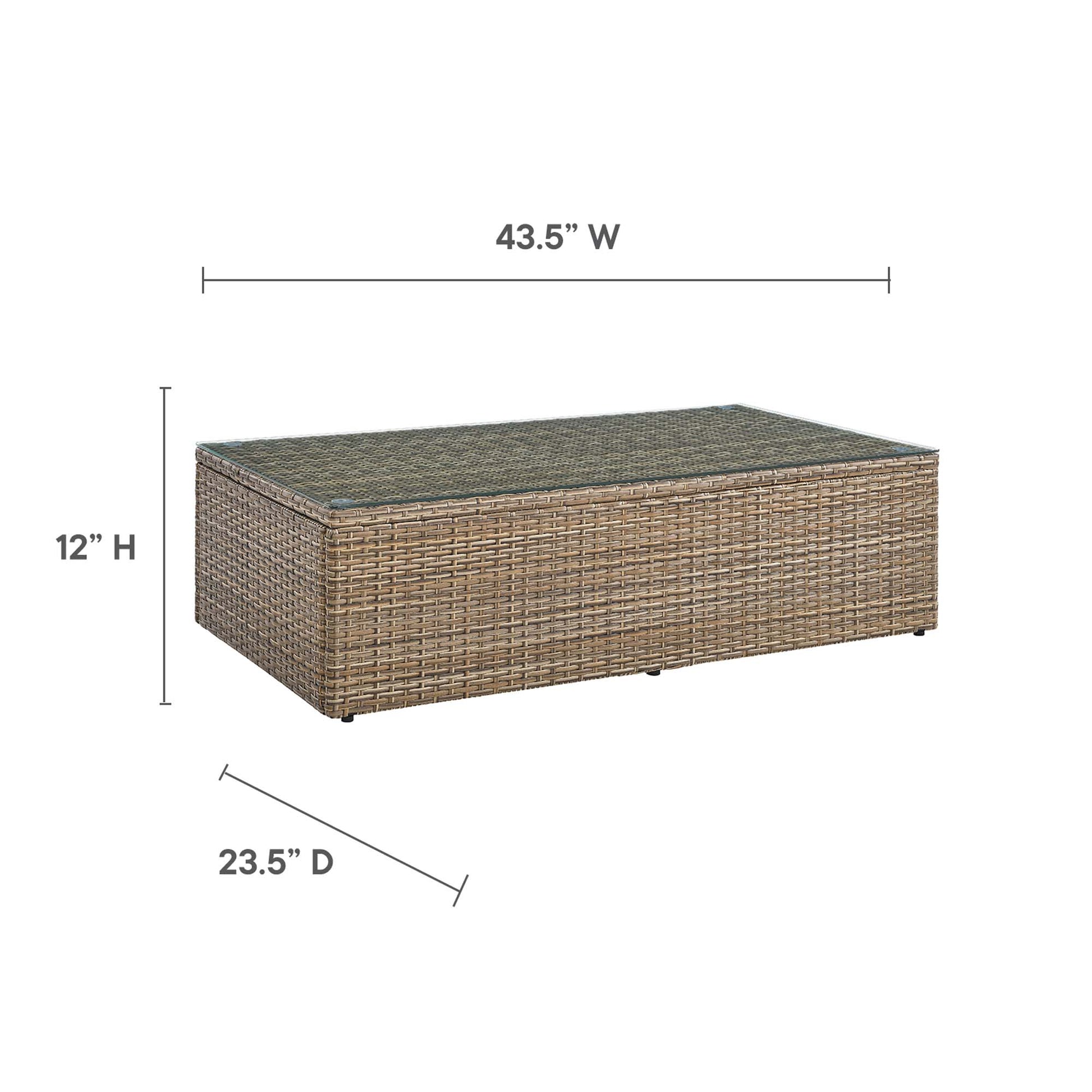 Surround yourself with warm weather and good company with the Convene Outdoor Collection. Made with synthetic rattan weave and a powder-coated aluminum frame, this outdoor coffee table leaves a positive impression on your guests while enhancing your patio, backyard, porch, or poolside with modern style and appreciated texture. Complete with an easy-to-clean tempered glass top and non-marking foot pads, this all-weather patio table is water and UV-resistant making it a lasting addition to your outdoor space. Assembly required. Easy to follow instructions included. Overall Product Dimensions: 23.5"L x 43.5"W x 12"H