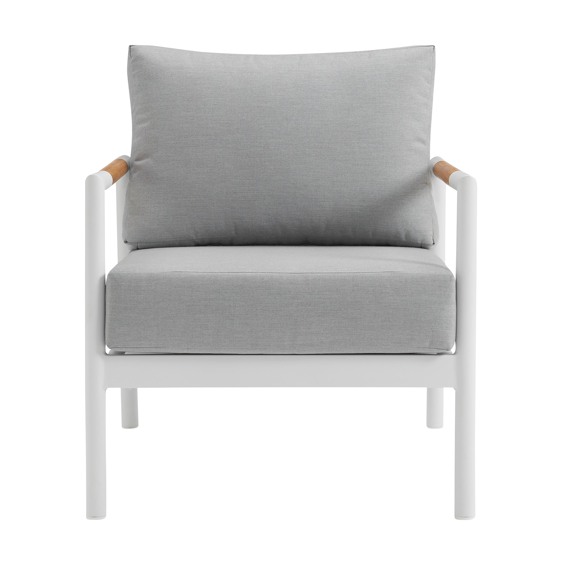 Crown 4 Piece White Aluminum and Teak Outdoor Seating Set with Light Gray Cushions