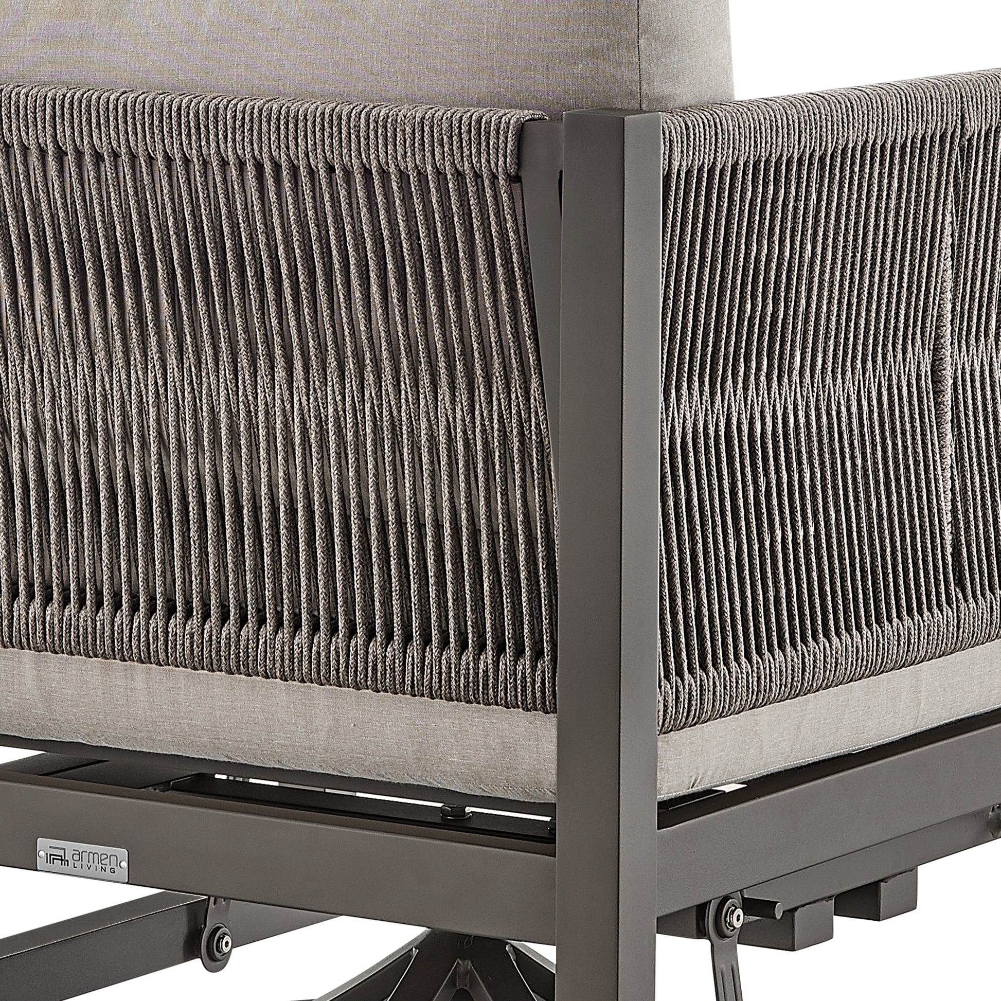Style and mobility come together with the Cuffay Outdoor Patio Swivel Lounge Chair in Aluminum with Rope and Cushions. This 360-degree swivel and gliding functionality add comfort, further enhanced with the high-density foam cushions. The durable materials come together beautifully to create a long lasting and fashion forward seating experience. The aluminum frame is ideal as aluminum cannot rust. This is especially beneficial in areas where moisture is present, making it a premium choice among residents of coastal cities or regions with high humidity. Polyester fabric is very easy to clean. This makes it a good option for outdoor cushions that will probably be covered with dust, dirt, and other outdoor grime regularly. In addition, most outdoor furniture is used as part of an eating area, making more stains and messes a real possibility. Polyester cushion covers can be thrown in the laundry and are naturally difficult to stain permanently. These weather resistant materials will stand up against UV, rain, and sun. The Cuffay swivel outdoor lounge chair is available in your choice of a black aluminum finish with gray rope and cushions, or a brown aluminum finish with brown rope and cushions.