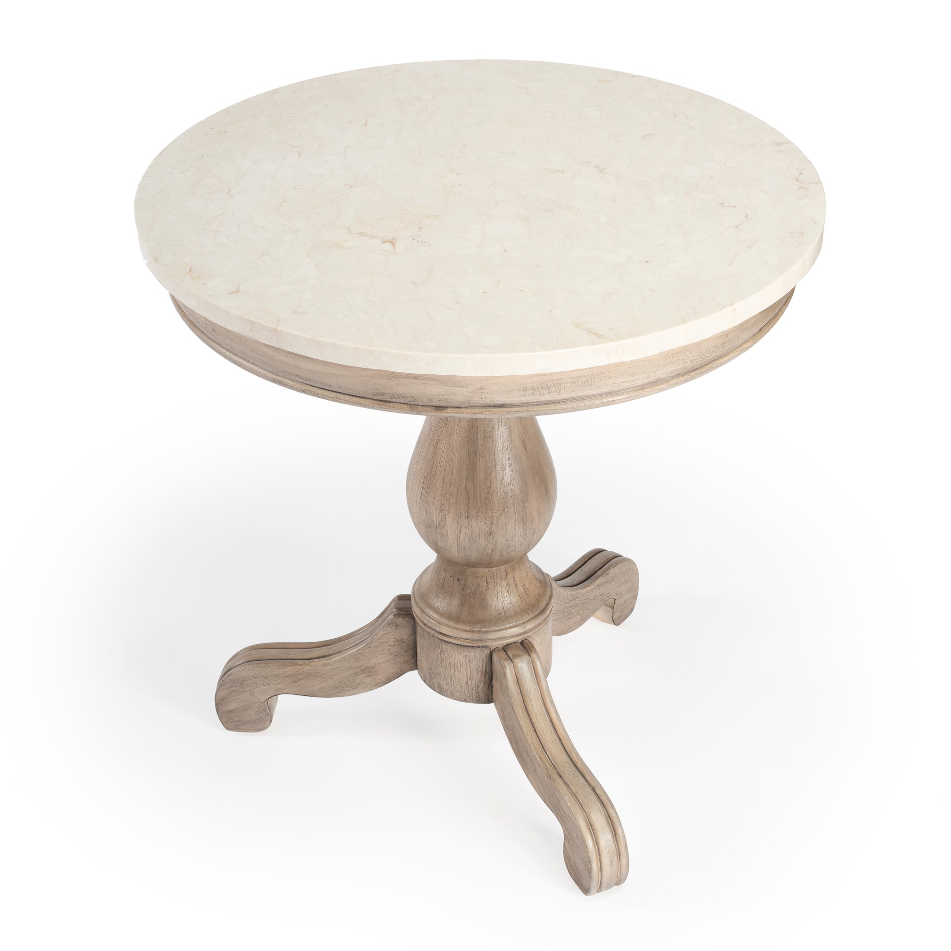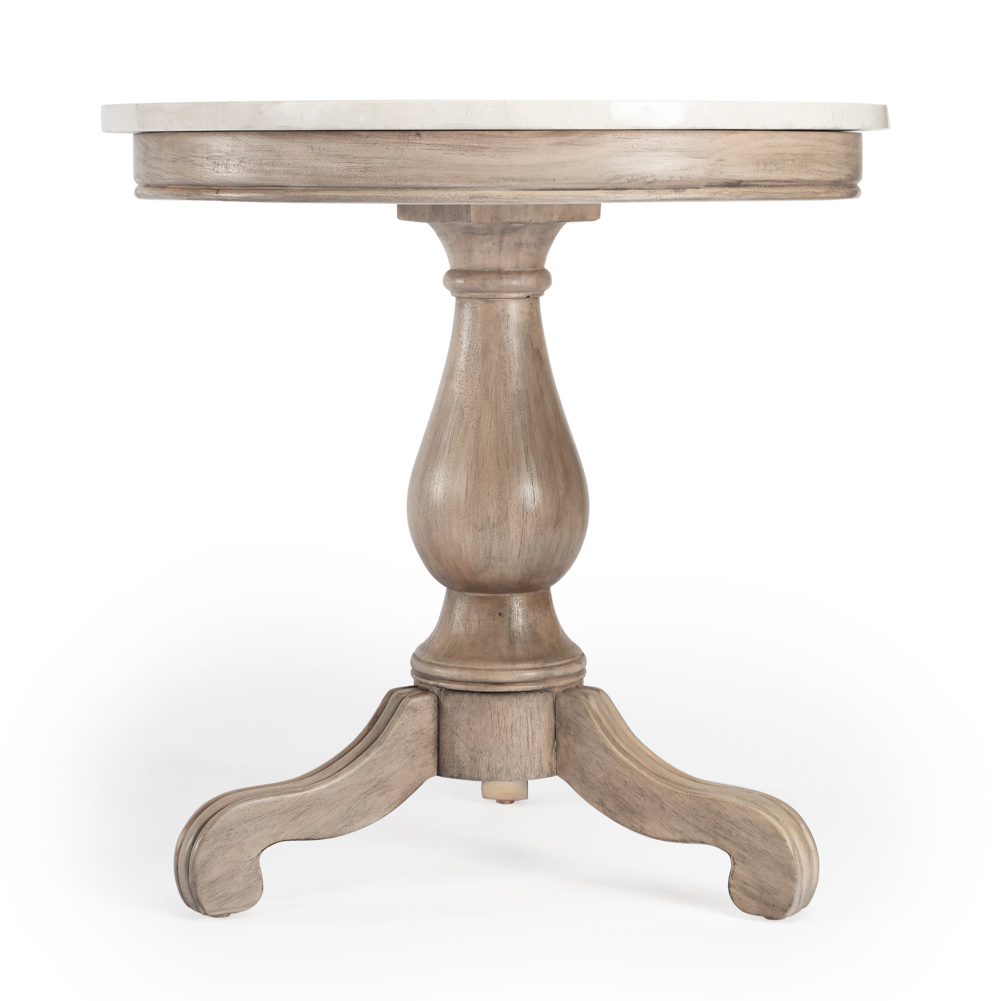 The Danielle marble collection offers an elegant and modern take on a farmhouse design. By using quality craftsmanship techniques and a gorgeous natural marble top, this round 24" side table creates an eye-catching piece that is both durable and functional in your living space. A gorgeous off-white melati marble top and a hand-carved wood pedestal base offer plenty of space for your decorative items, and it's offered in a choice of finishes including Rustic Gray, Sandalwood Beige, and Weathered Black. Dimensions: 24"W x 24"D x 24.25"H