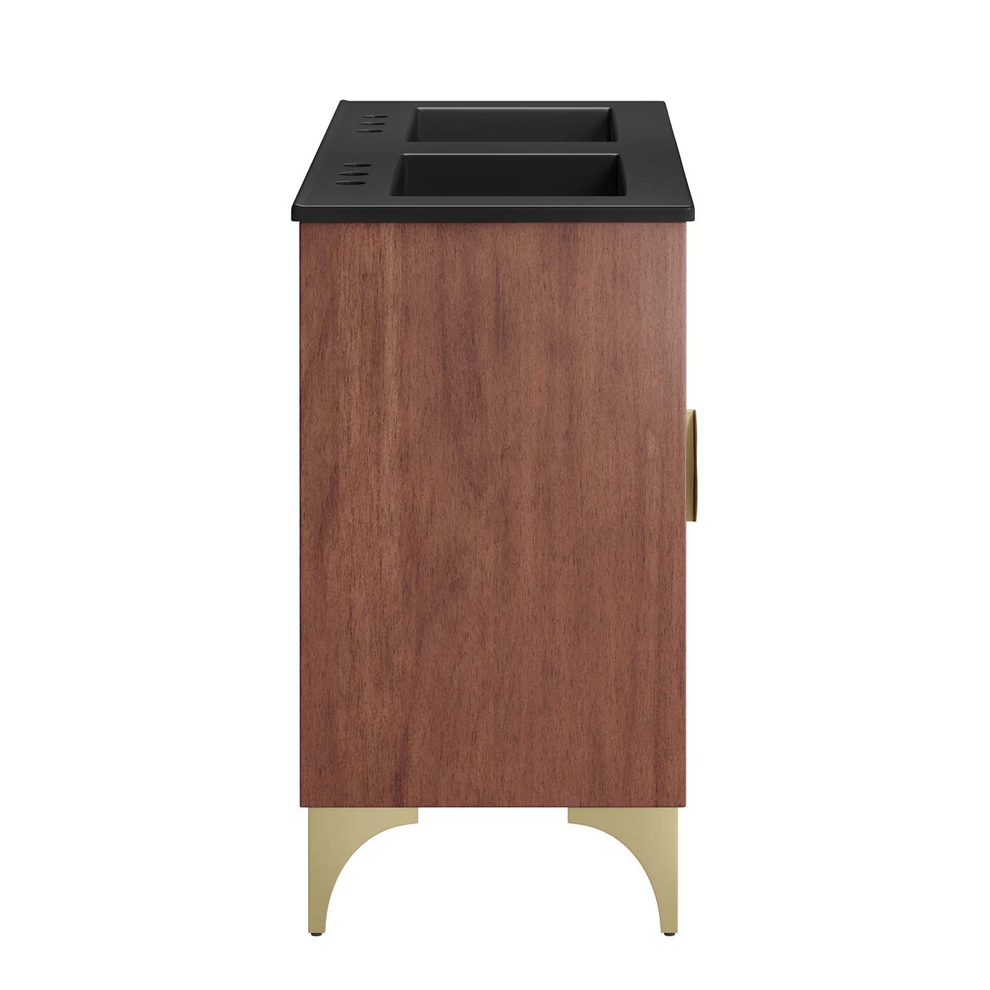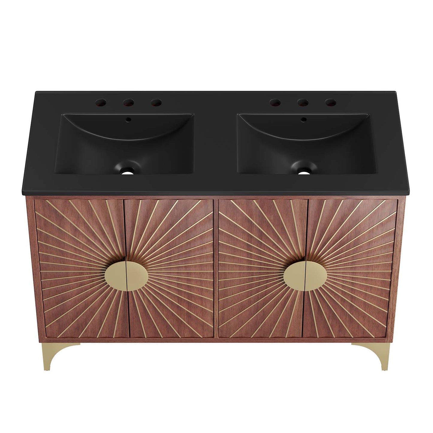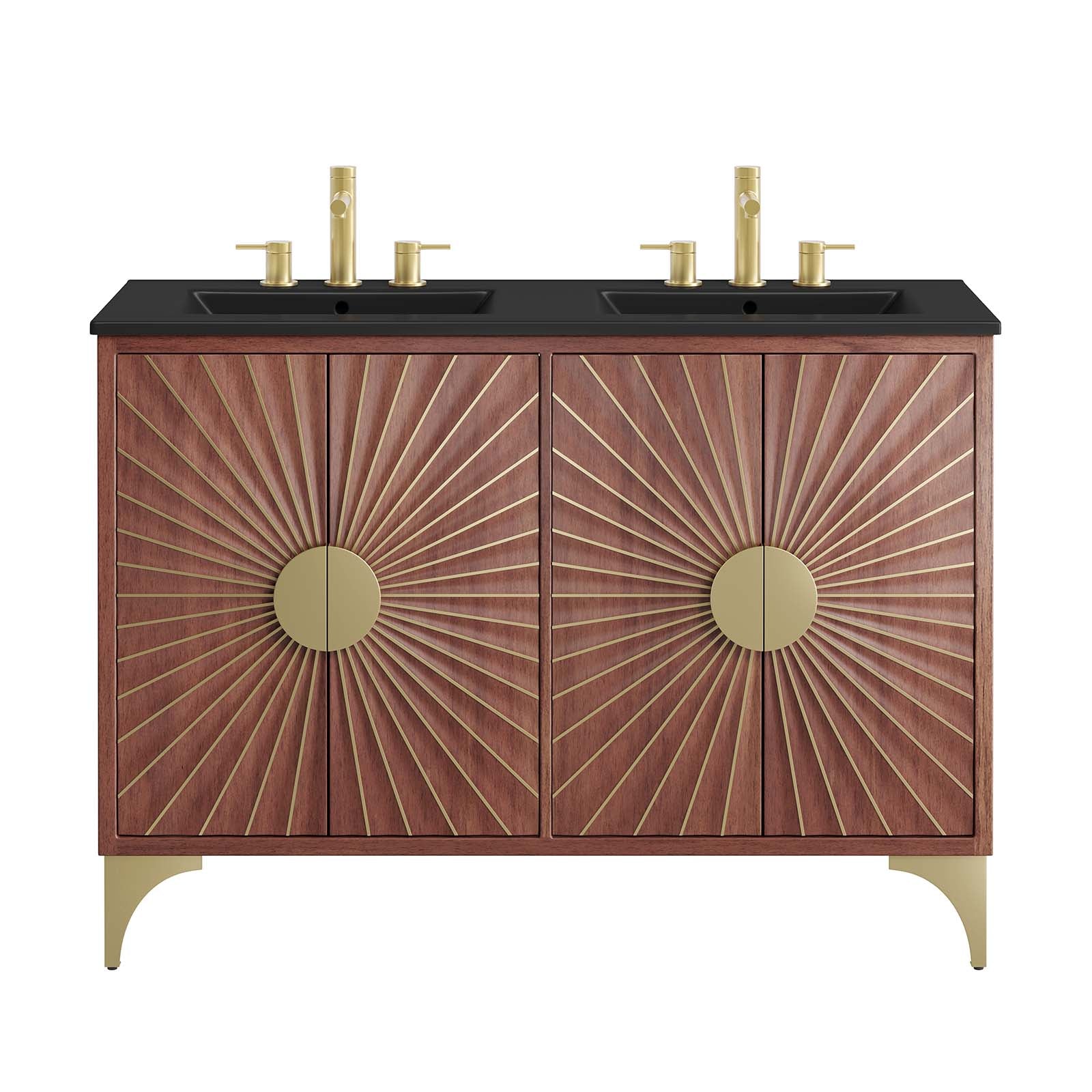 Bring refreshing energy into your bathroom space with the Daylight 48" Double Sink Bathroom Vanity. Beautifully crafted with solid mango wood and a rich wood stain, this bathroom cabinet features a sun ray design made possible through intricate powder-coated brass details and hardware. This vanity cabinet is a complete addition to a bathroom with a ceramic double sink basin and an integrated countertop with 8" centerset holes. Resting on a brass base with arched details and non-marking foot caps, this bathroom vanity offers ample storage space for bathroom essentials with the spacious open shelf and pull-out drawer. This dual sink has 8” between basins and 24” between basin drain holes. Fixtures not included. Assembly required.