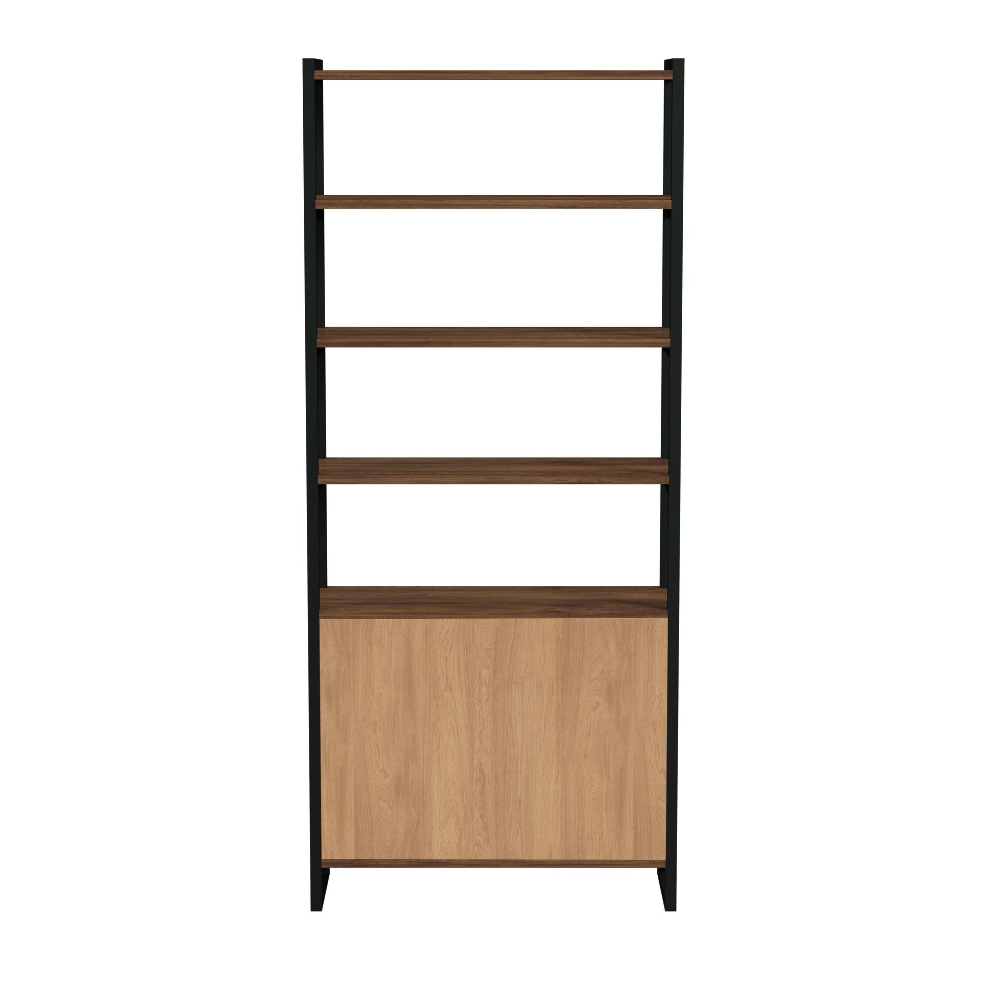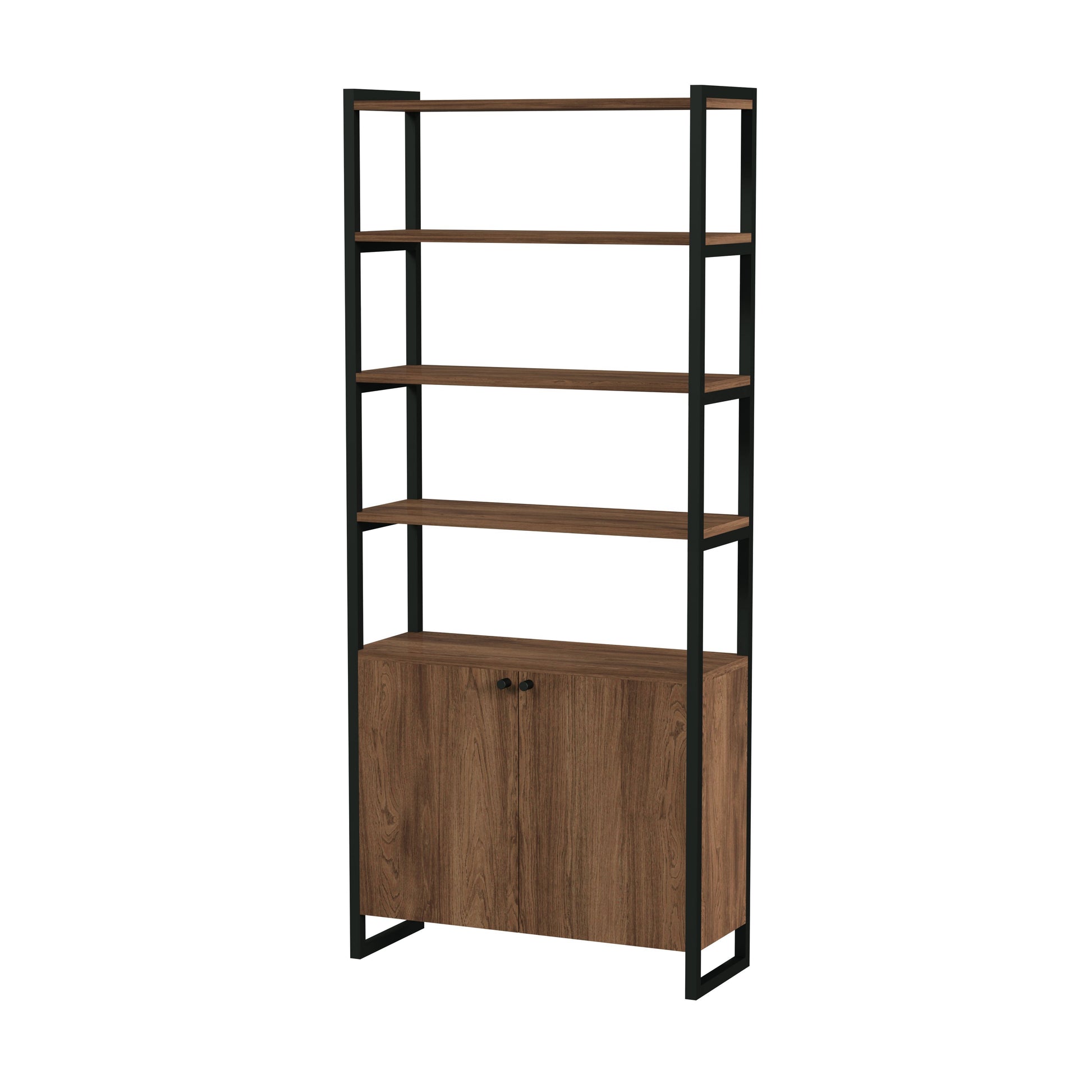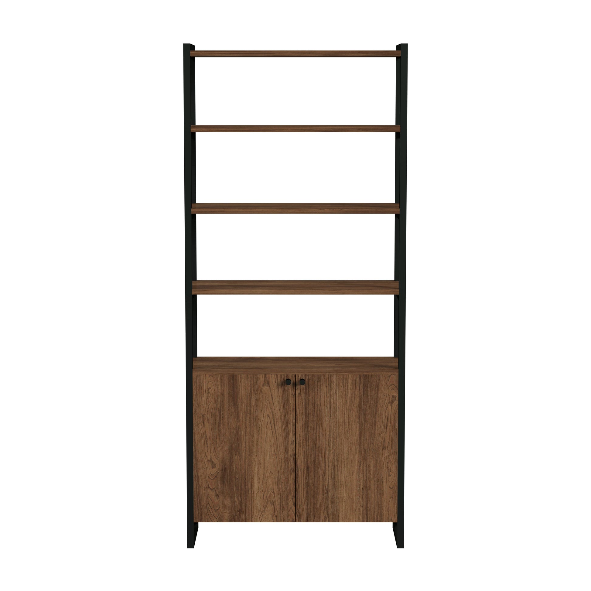 Made from rich veneered walnut and a black powder coated steel frame, the Drake 73" 2 Door bookcase brings a modern flair to your space. It gives you the storage you need to display your favorite books and decor and features a large storage space for the things you don't want everyone to see. Pair one of these besides a matching Drake desk or even by itself as a standalone piece or with your existing office items or living room decor for a multi-purpose bookshelf. Dimensions: 32"W x 12"D x 73"H