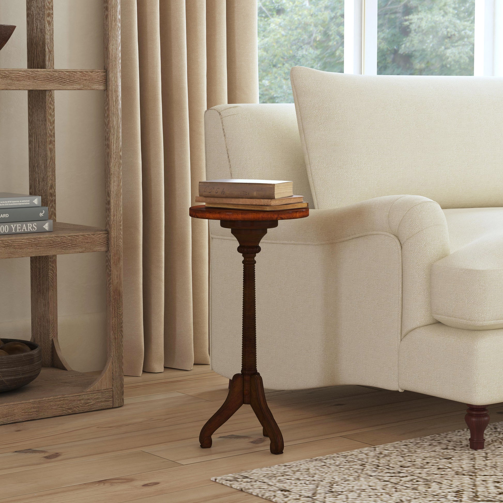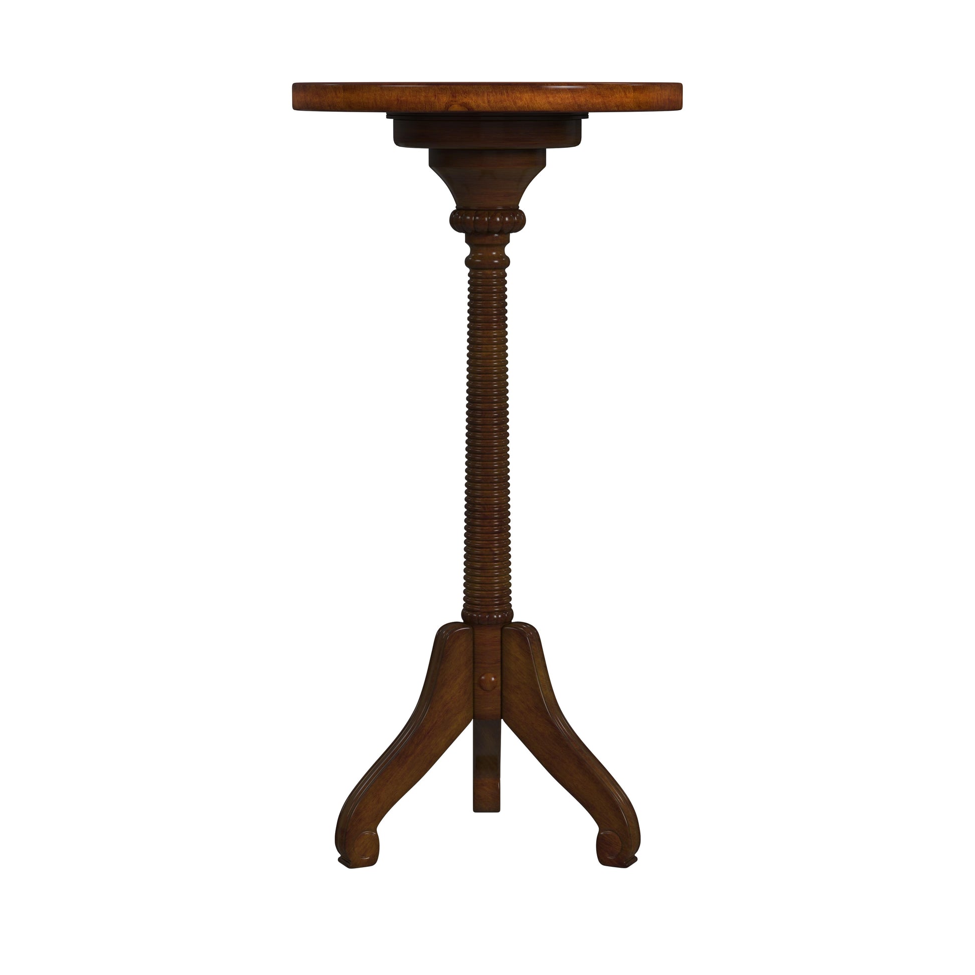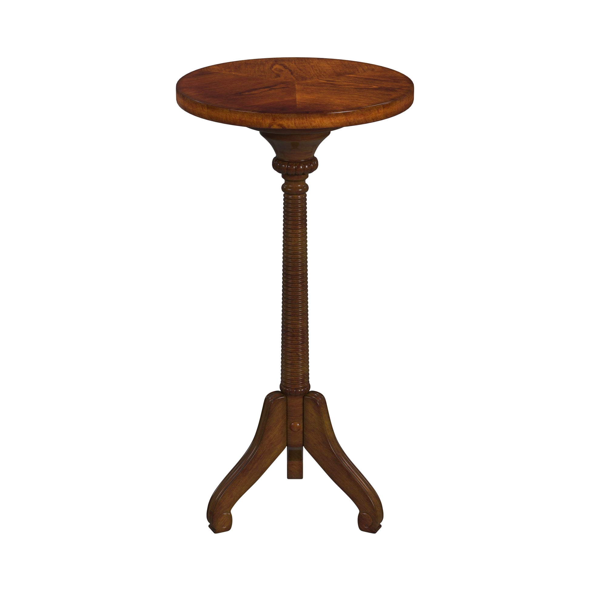 Florence Pedestal Side Table in Dark Brown 1583011 A compelling harmony among the three legs, the meticulously turned pedestal and the elegantly understated top make this pedestal table a stunning enhancement for an already well-furnished room. Crafted from poplar hardwood solids and Wood products the table boasts a gorgeous antique cherry finish. The color is a medium to dark brown with antiqued detailing and distressing 3 Leg pedestal base made of solid wood Easy assembly in 3 simple steps by attaching the post to the top and base by screwing in a bolt. Gorgeous turned post with ribbed appearance that connects the top to the pedestal base Dimensions: 12"W x 12"D x 24"H