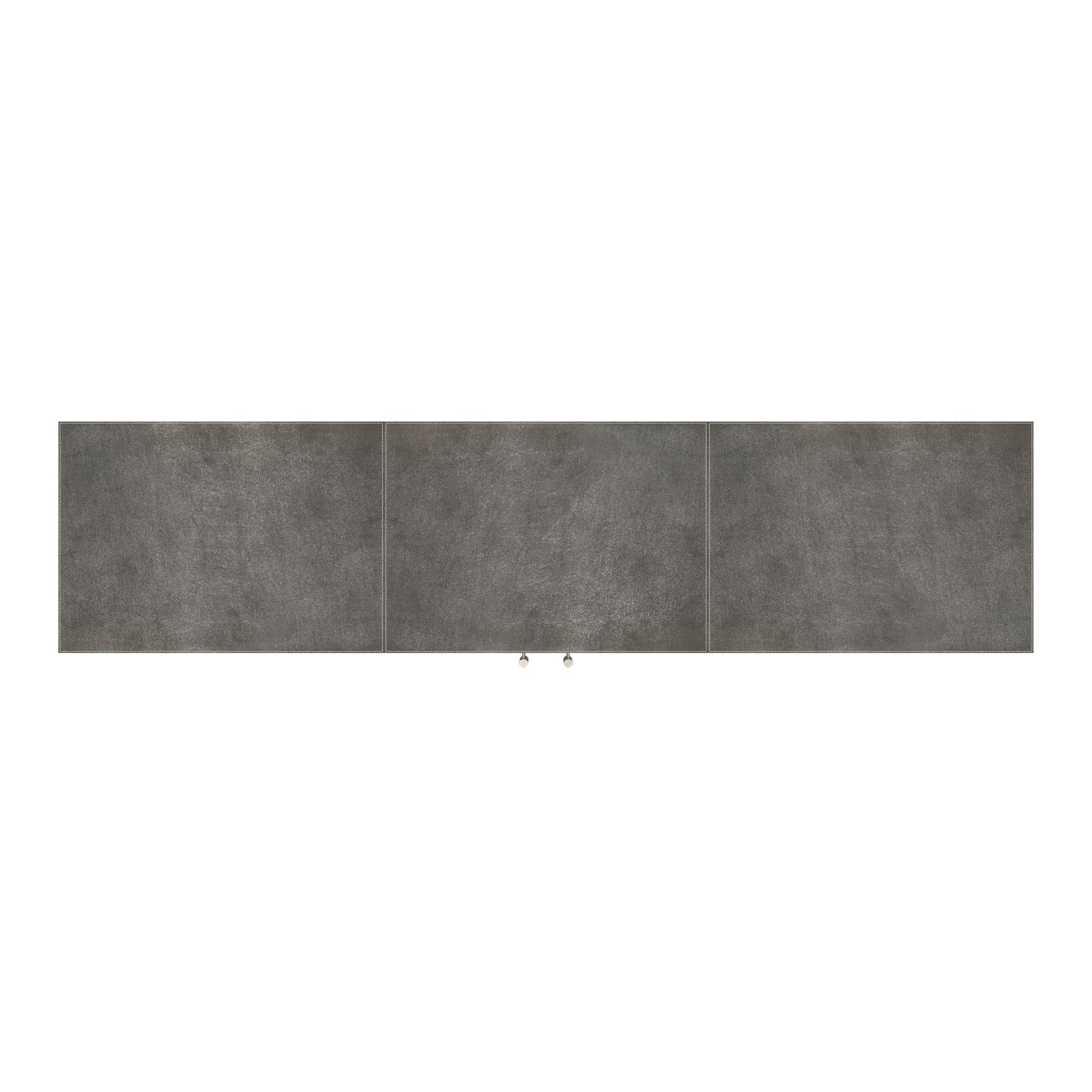 This modern buffet is magnificent in every conceivable way. Its sleek lines are adorned in finely tailored leather atop a silver platform base. Its two doors feature silver-finished handle bar pulls open to reveal a luxurious interior fully lined in poly suede with meranti wood trim and offer two adjustable shelves in each of the two side storage compartments. There is one adjustable shelf in the center storage compartment and a tray drawer with a silver leather front. This is meticulously and expertly crafted and features ball-bearing glides for smooth operation. Masterfully crafted from meranti wood solids and wood products. Dimensions: 70.5"W x 18"D x 34"H