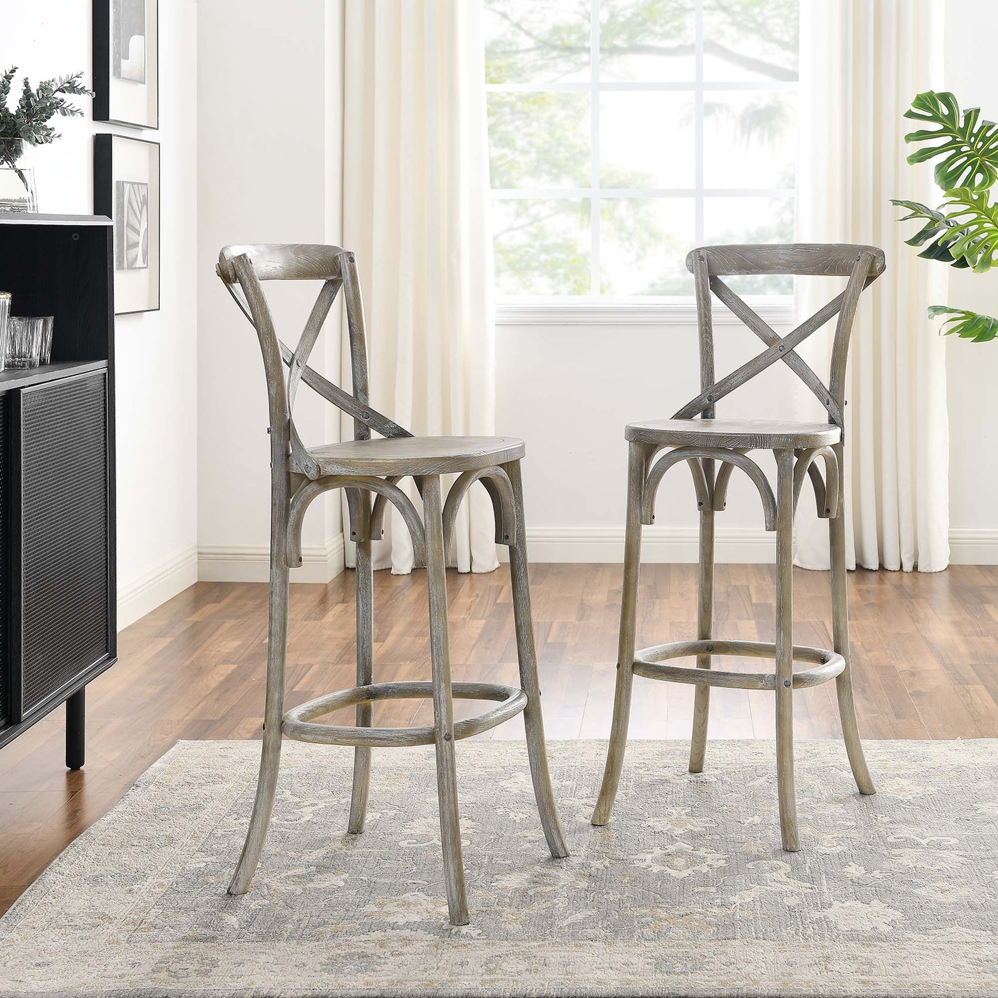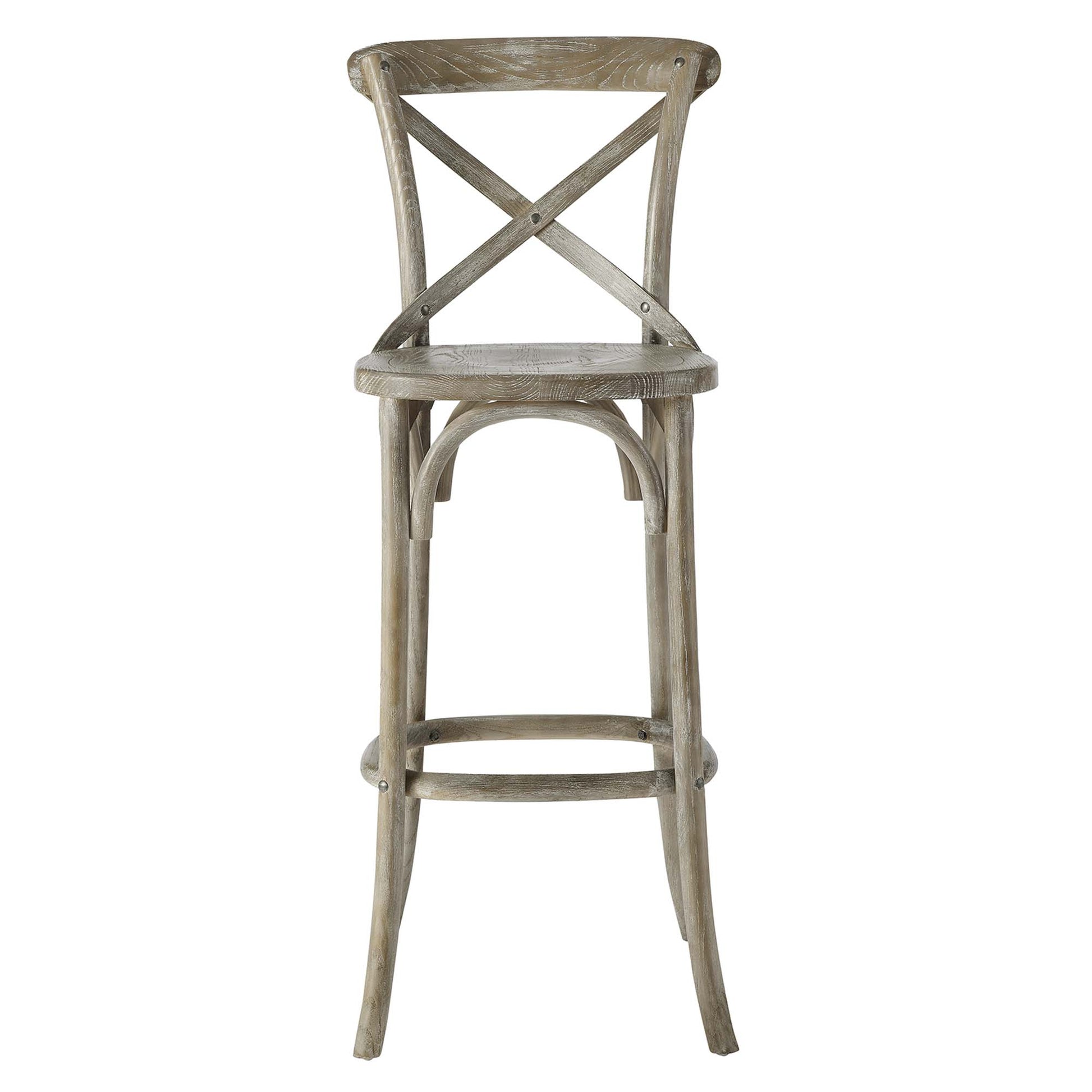 Introduce feelings of nostalgia as you gather around the kitchen counter for a quick breakfast or dinner with friends with this charming bar stool. Blending farmhouse charm with modern style, this bar-height stool features an X-brace back and stretchers between splayed legs, creating an inviting atmosphere in any dining space or kitchen area. Crafted from durable elm wood, this stool is built to last, ensuring a sturdy construction that can support up to 330 lbs.