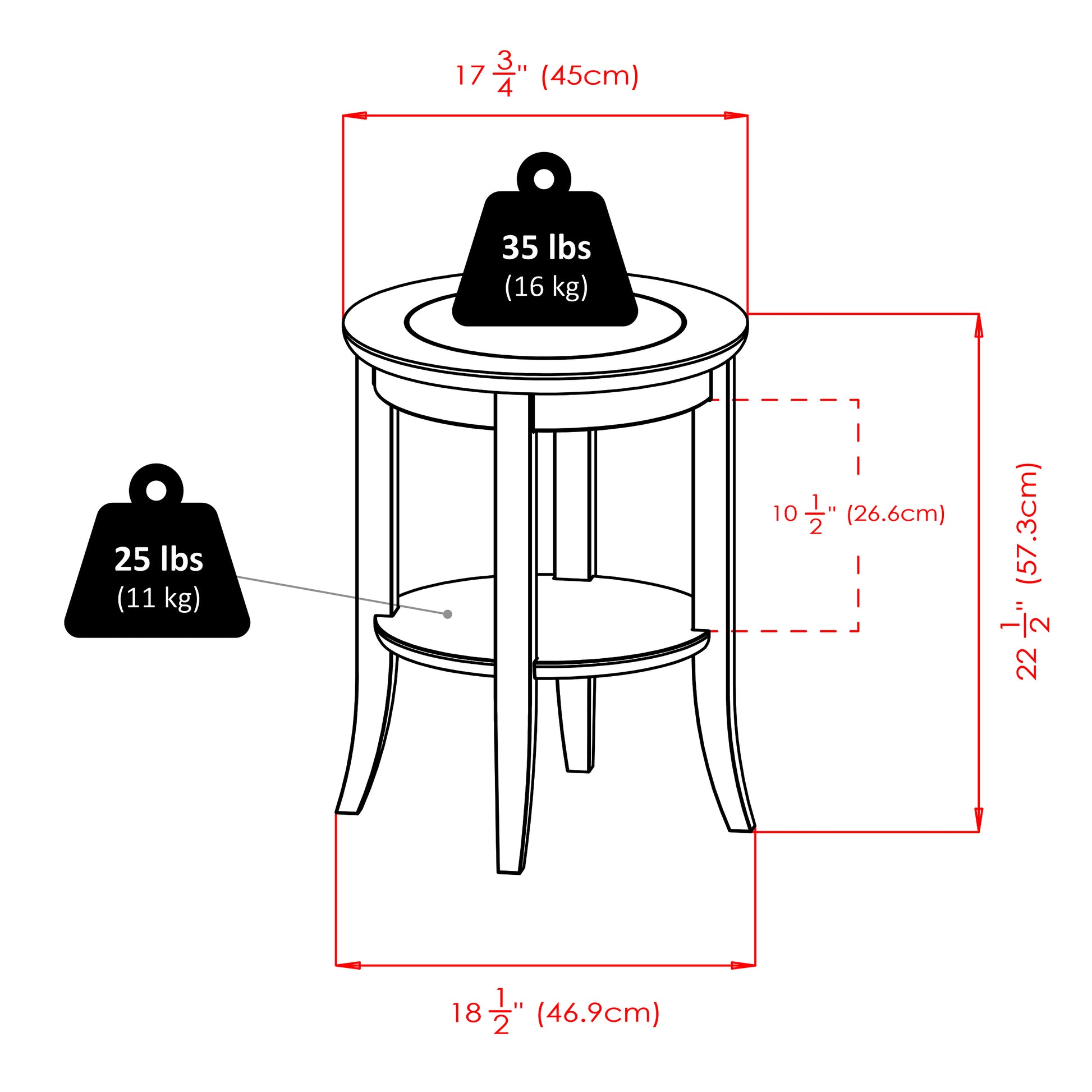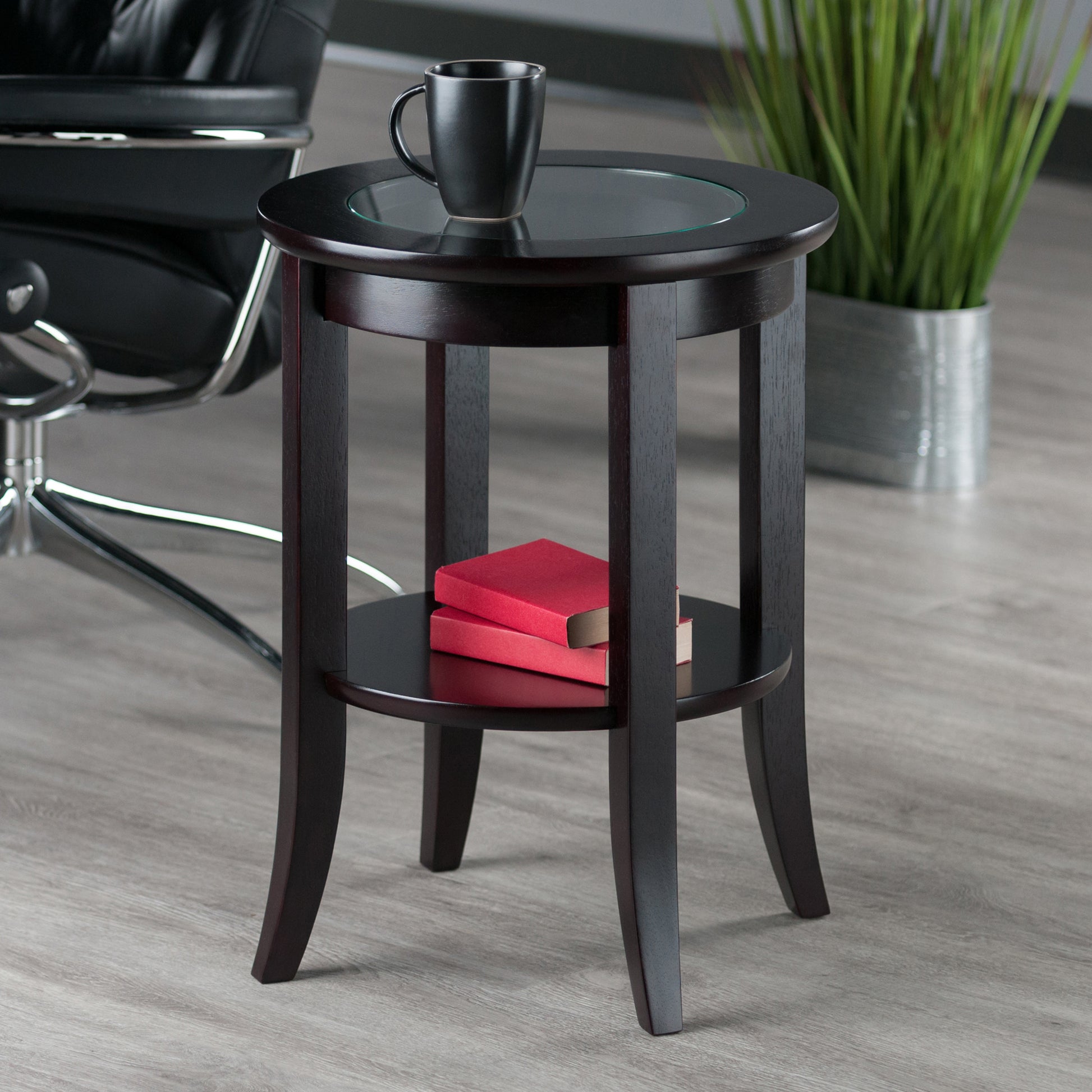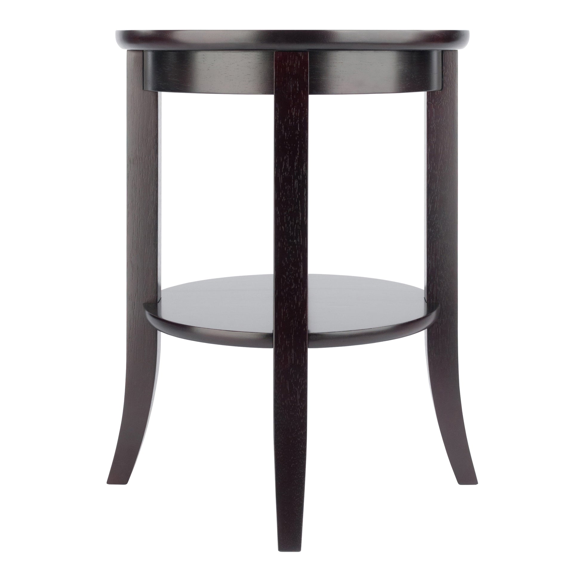 Enhance the decor of your room with the Winsome Wood Genoa Round End Table. A sleek, modern design that will easily blend with existing decor or gives a traditionally styled room an instant makeover. This round end table features an inlaid tempered glass top, a shelf for displaying and lightly flared legs that add a final decorative touch. Perfect accent table to add to your living room or family room. Finished in a rich espresso and constructed of solid and composite wood for long-lasting durability. Complete your space with the additional items from the Winsome Genoa collection (each sold separately). Conveniently packed and shipped in 1 box, that includes the hardware necessary for assembling. Replacement part request can be submitted directly to the manufacturer within 60 days from date of purchase.Dimensions : 18.47 in. Wide 18.47 in. Deep 22.56 in. High