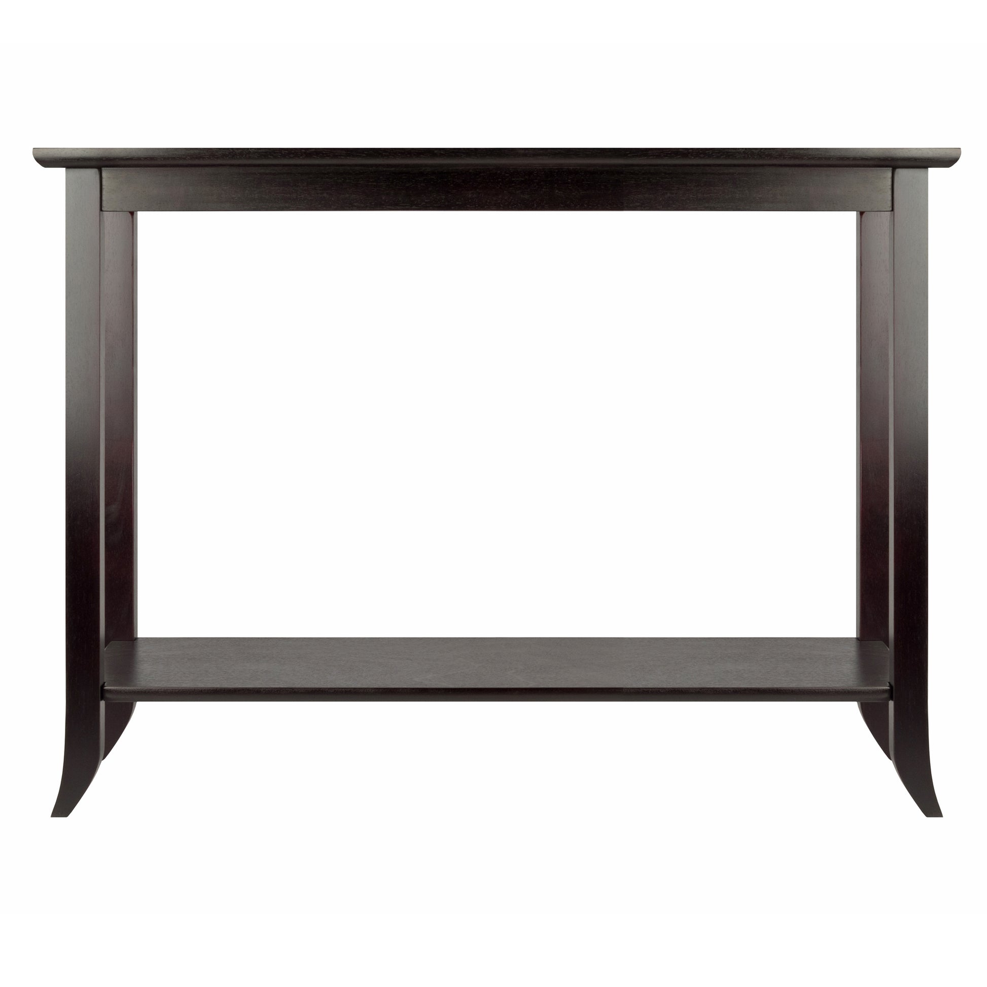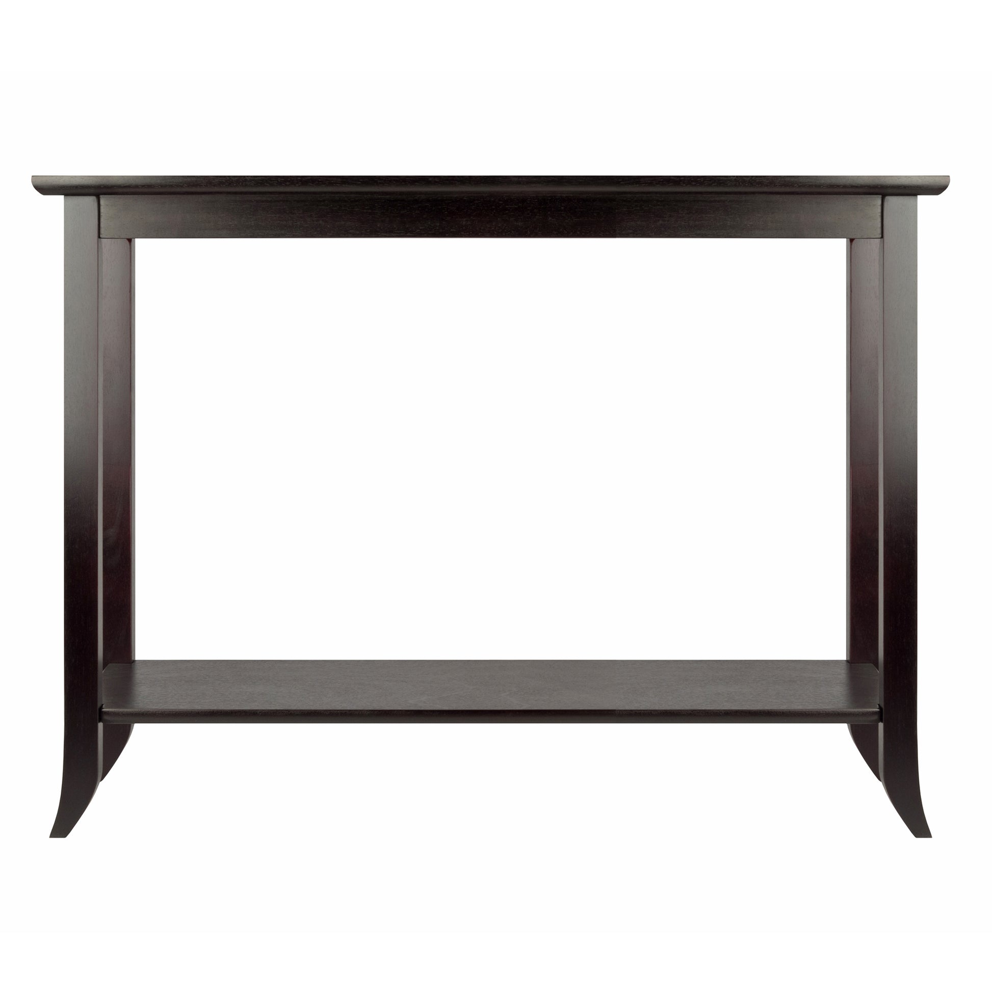Slight flaring at the leg tips and a tempered glass inset give Winsome's Genoa Console Table a distinctive edge. Use it in the living room, dining area, or entranceway where you can place a vase of flowers or a favorite plant on the glass inset without worrying about water marks on the wood. A large lower shelf is there for keeping serveware or displaying photos or gifts you've collected on your travels. The rich espresso finish will look right at home in any setting, from transitional to contemporary. Made from solid and composite wood with tempered glass. Conveniently packed and shipped in 1 box that includes the hardware needed for assembly.
