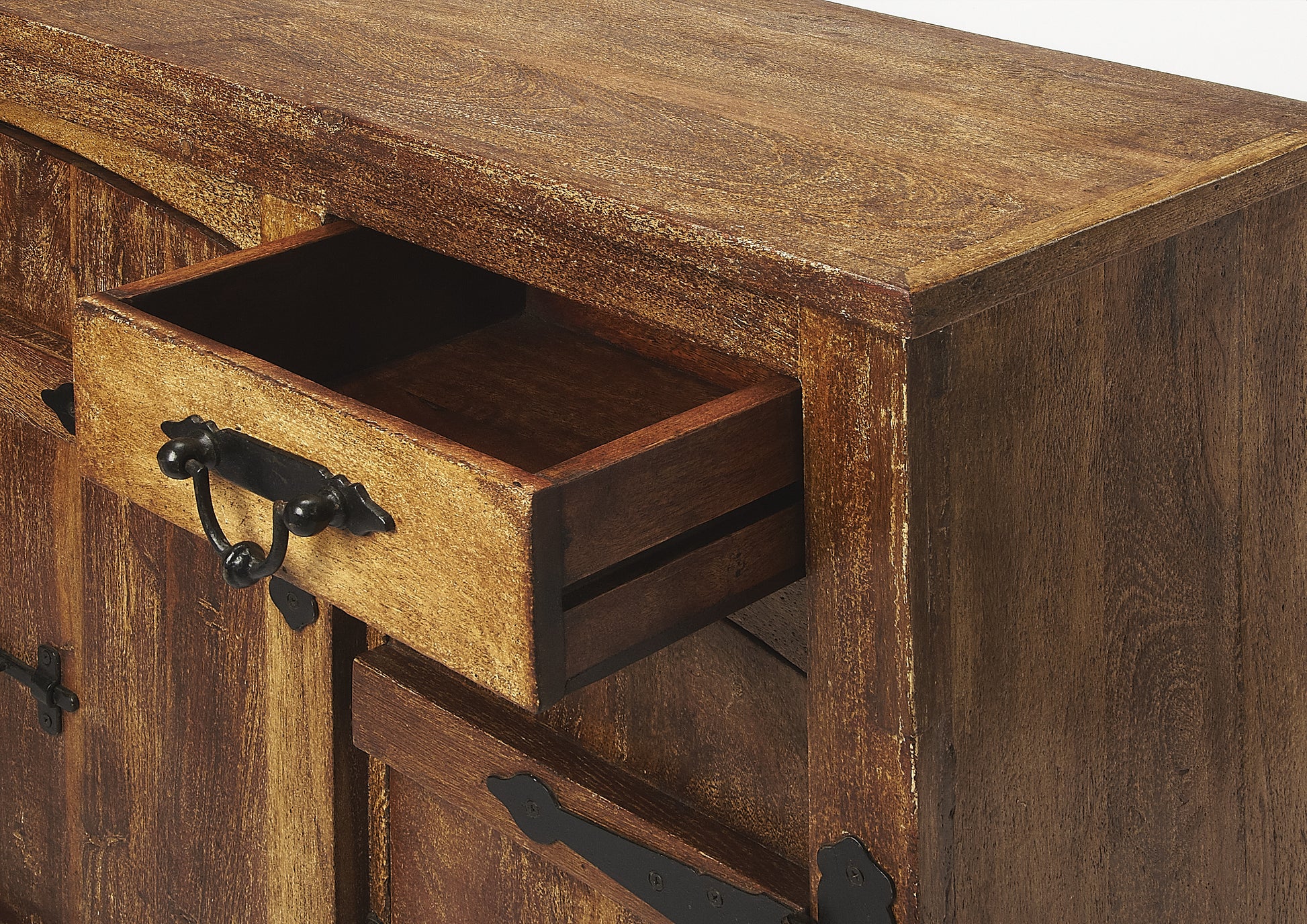 Modern entertainment meets rustic design in this solid Wood sideboard. Each piece is uniquely characterized by natural color variations and hand finishing techniques reminiscent of the reclaimed look. Its ample interior is perfect for stowing some of life’s most important necessities whether it be stemware, linens, spirits or otherwise. Dimensions: 59.5"W x 18"D x 38"H