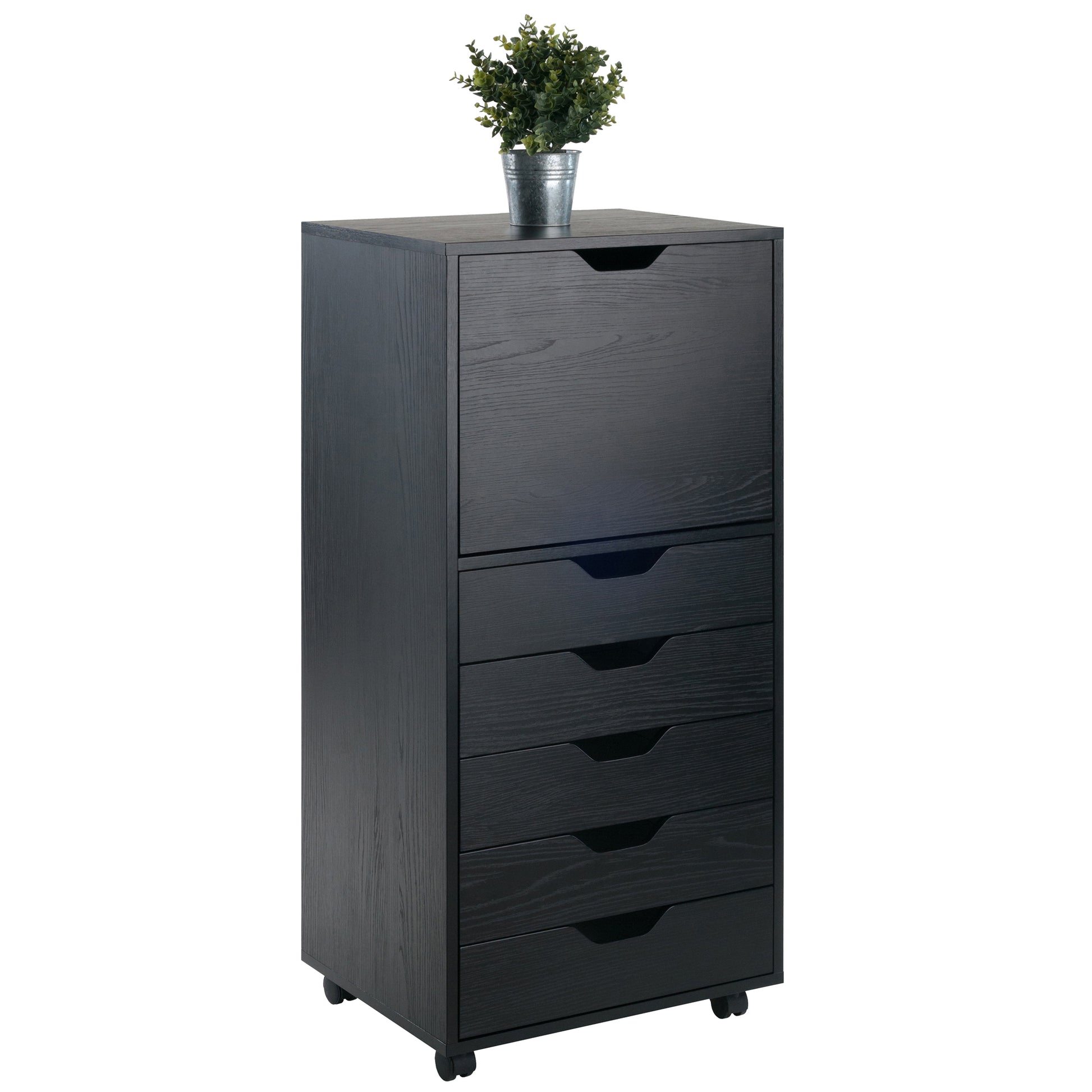 Use the Winsome Wood Halifax 5-Drawer High Cabinet for a variety of organizational needs. A clean, simple design that you will find function to in just about any room of your home. Eliminate the appearance of clutter in your bedroom, craft room, dorm, kitchen or office. The Halifax storage carts feature a multitude of drawers with cutout drawer pulls that allow for easy-open access and helps create an easily accessible storage unit. Store paper and other material used for a business in your in-home office or den. An ideal storage addition to your walk-in closet, with 5 easy glide drawers with an interior dimension of 15.9”W x 11.8”D x 2.6”H perfect for jewelry, styling accessories, makeup pallet and brushes. The upper cabinet has a spacious interior of 17.95"W x 14.65"D x 14.57"H, suitable for slightly larger items or linens. Sitting on four casters, two of which lock, allowing for easy mobility when needing to move or locking in place to use as a stationary. Constructed of sturdy composite wood in a black finish that is sure to blend with any decor. For additional storage, pair with other organizers from the Winsome Halifax collection. This item conveniently ships in 1 box, that includes the hardware necessary for assembling. Replacement part request can be submitted directly to the manufacturer within 60 days from date of purchase.
