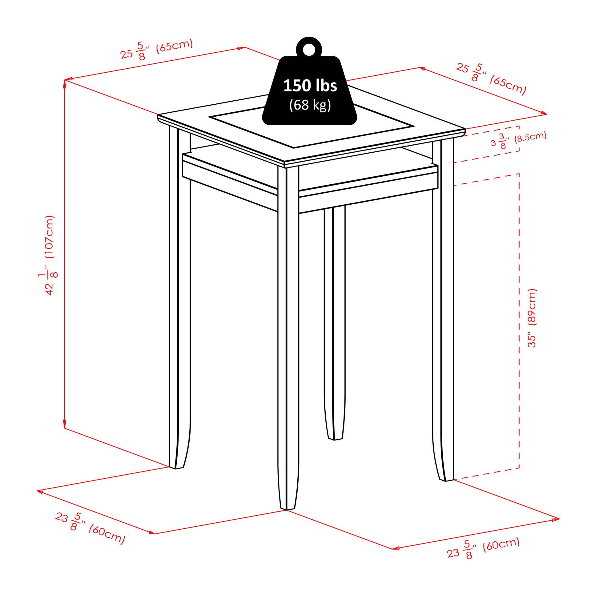 Entertain your guests around this sleek pub table accented with tempered glass providing a clear view to the shelf below. This unique configuration is functional as a display case or even storage for handbags and small accessories. Its long elegant legs lightly holds up the table with it's slight curved end. 2 V-Back Chairs complete the set with their elegant design and smooth curved legs. Top Dimensions is 25.6"W x 25.6"D. Shelf is 20.1"~22.5"W x 20.1"~22.5"D. Shelf clearance is 3.2"H. Distance between legs is 20.1" and the height from the bottom shelf to floor is 25.5". Chair seat dimension 16.6"W x 15.6"D. Back rest dimension 17"W x 12.2"D. Seat height is 30". Static weight capacity is 220lbs. The table is made of solid wood with the glass panel and comes in a walnut finish. Assembly required.Dimensions : 25.59 in. Wide 25.59 in. Deep 42.13 in. High