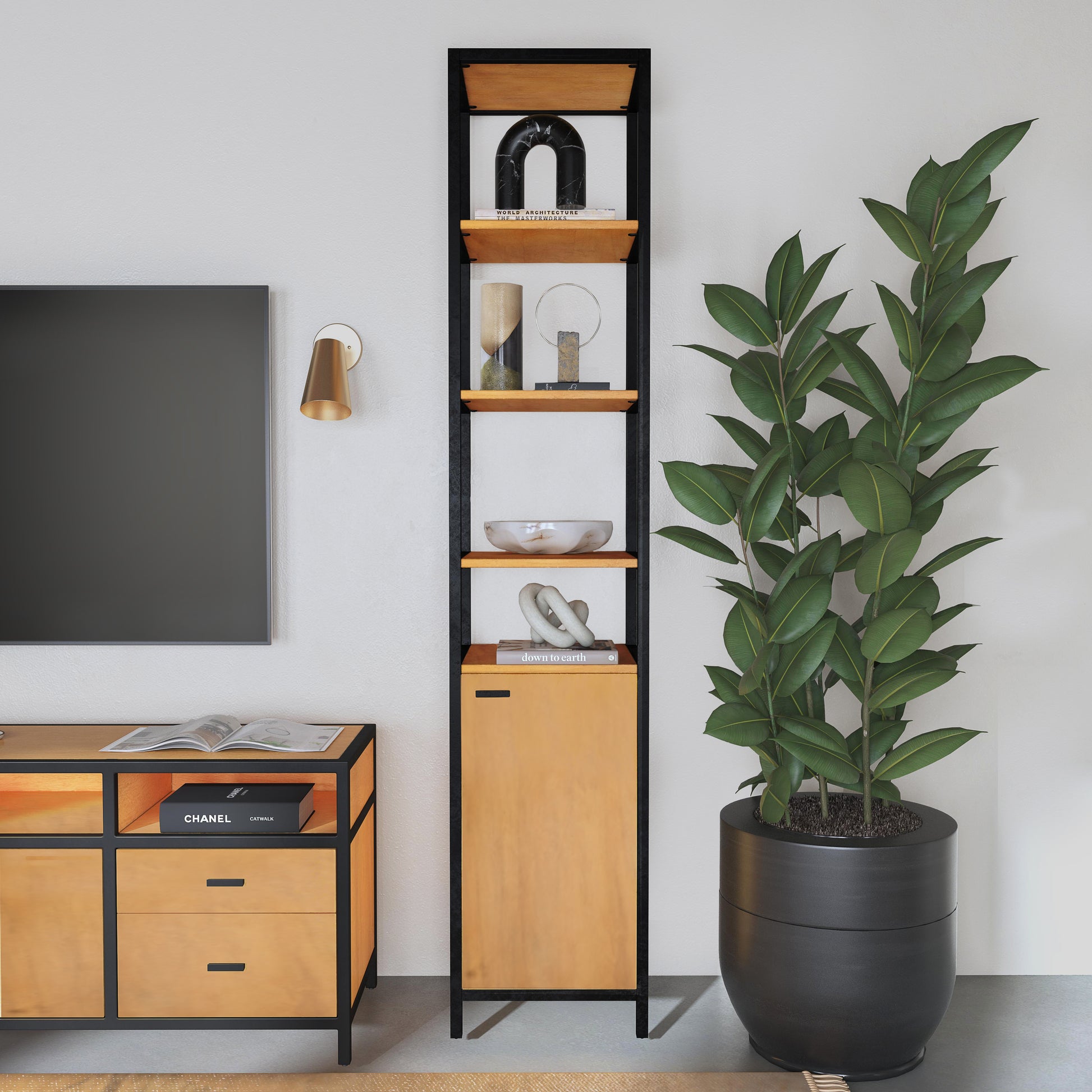 Whether you want to display books, novels, or your most cherished decorative pieces, this narrow ?tag?re bookcase measures 84.5†tall and 17â€wide allowing it to fit in nearly any space in your home. It's crafted from Mango Wood, Gamelina Veneers, MDF, and is framed in iron that’s finished in a smooth black epoxy for added durability. There are 3 open shelves up top and a roomy cabinet with 1 adjustable shelf on bottom dawning bronze hardware in a matching black finish. Place this piece in an office, living room, bedroom or family room and it’s sure to be a focal point. Assembly is needed. Wipe clean with a dry cloth. Dimensions: 17"W x 16"D x 84.25"H