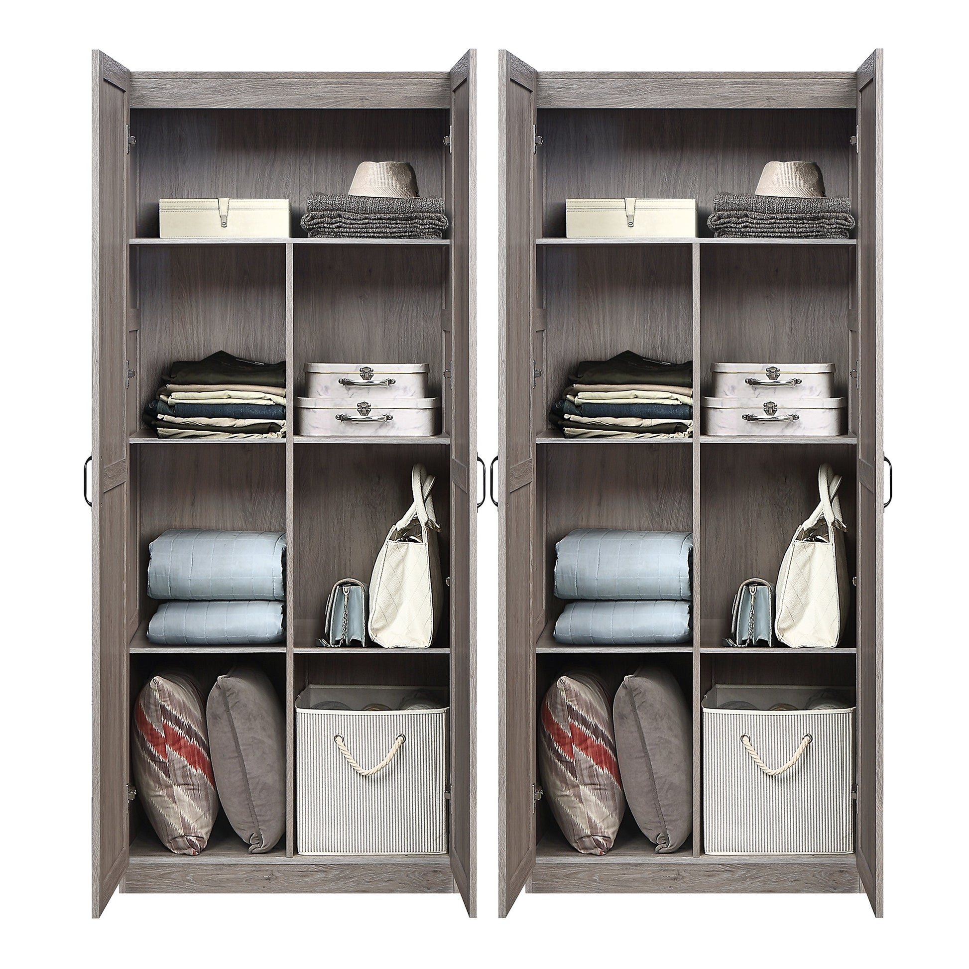 Practical storage and clean design meet in the Hopkins Storage Cabinet. Sized to fit any space large to small, the Hopkins delivers. With 14 large cubby compartments, this cabinet offers ample space to stow away clothes, shoes, accessories, or anything that needs to be tucked away. The 90° open door style with European soft close door hinge design creates a luxurious feel without the cost! • Modern Free Standing 2 Sectional Wardrobe Closet with Storage Compartments for Bedroom and Storage Use.
