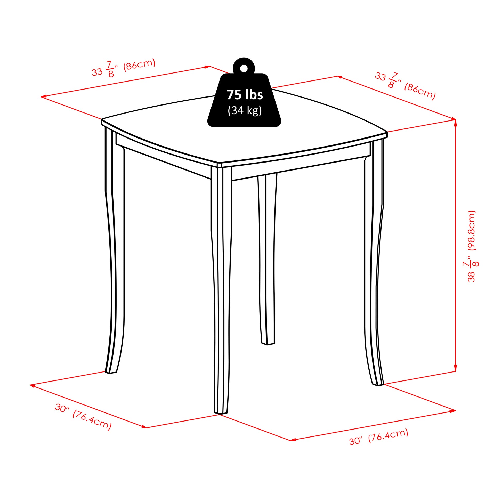 3pc Set comes with Inglewood High Table features Curved Table Top with flare legs. Constructed from Solid wood in Antique Walnut Finish. Cushioned Saddle Stool with Black PVC Seat and Solid wood legs complete the set. Perfect for any kitchen.Dimensions : 33.86 in. Wide 33.86 in. Deep 38.9 in. High
