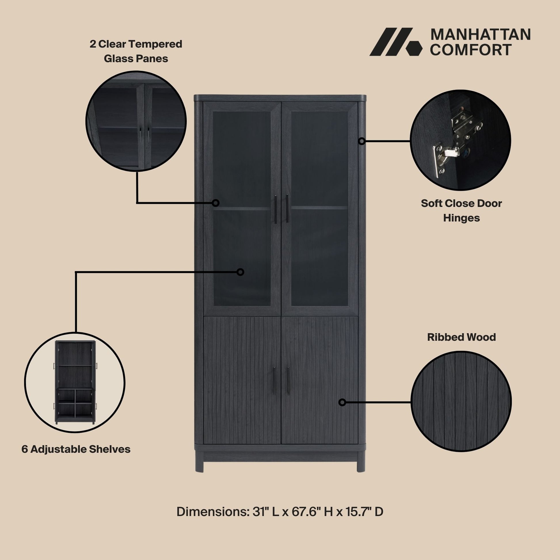 • 2 Soft Close Tempered Glass Panel Display Doors on Top and 2 Ribbed Manufactured Wood Soft Close Doors on Bottom.