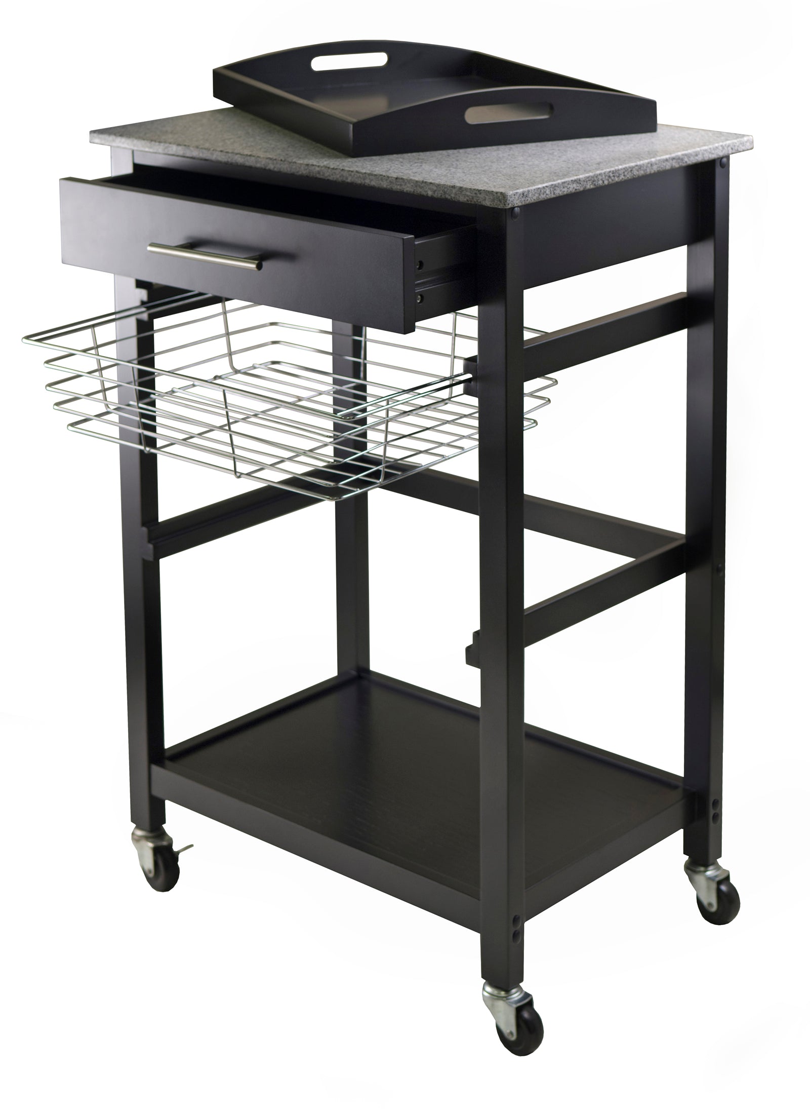 Give your kitchen a modern, functional touch with this Winsome Wood Julia Utility Cart. This remarkable cart provides many uses and its compact size makes this cart perfect for a small kitchen needing more storage or additional counter space for a small appliance. Featuring a granite top that provides easy-to-clean work station perfect for preparing drinks or lunch. The center serving tray is removable and has cut-out handles on each end, that is ideal for carrying for snacks out to the kids or guests. Store utensils or silverware in the drawer, and right below kitchen towels in the slide out metal basket for quick access. The bottom fixed shelf is great for bowls or additional storage. Easily roll out from kitchen to dining room, this cart sits on 4 casters, two which lock to keep stable while in use. Constructed of sturdy solid wood and composite finished in black that allows this cart to blend well with most home decor. Packed in one box, with hardware necessary for assembly.