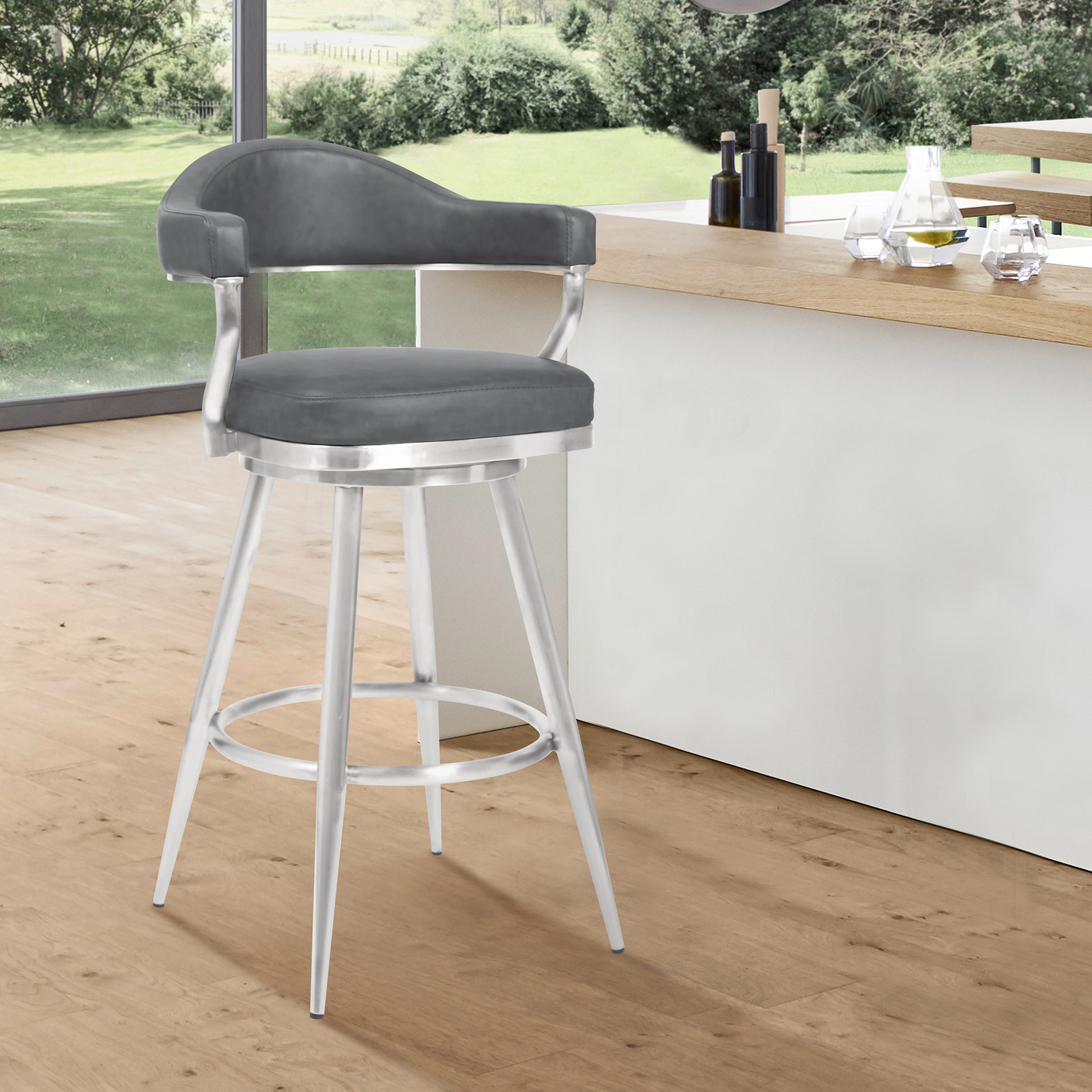 Designed with practicality in mind, the legs come equipped with floor protectors to prevent scratches and damage to your flooring while moving the stool. Available in varying seat heights, this versatile bar stool fits seamlessly into any decor, whether you prefer a sleek black finish, a warm brown option, or a modern brushed stainless-steel look, paired with an array of classic faux leather upholstery choices.