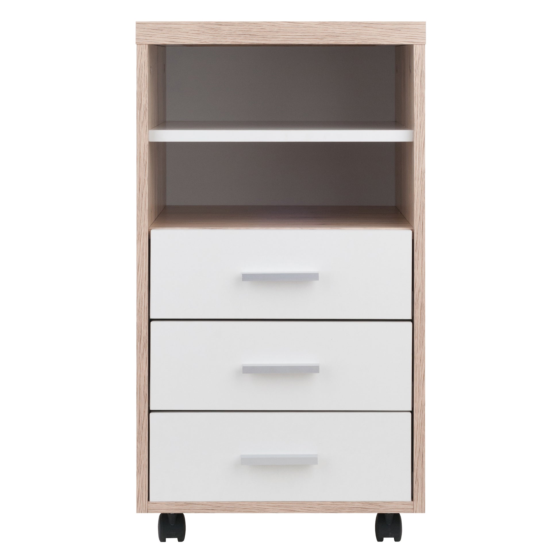 Customize your home or professional workplace with the Kenner Mobile Storage Cabinets. This Winsome Wood Kenner 3-Drawer Storage Cabinet is practical and functional on its own or can be combined with the Modular Desk Top along with any of the other Kenner Mobile Cabinets (each sold separately). The storage unit, which has 3 drawers and 2 open shelves, is ideal for a home office, artist's studio, or anywhere you need storage with a bright, contemporary look. The unit moves easily on sturdy casters, two of which lock. And the styling of the cabinet is as handsome as it is versatile. The frame is made of durable composite wood in a finish that has all the appearance of natural reclaimed wood. The cabinet facings and shelf are finished in linen white with modern matte-silver plastic cabinet drawer and door pulls. Conveniently packed and shipped in 1 box, that includes the hardware necessary for assembling. Replacement part request can be submitted directly to the manufacturer within 60 days from date of purchase.