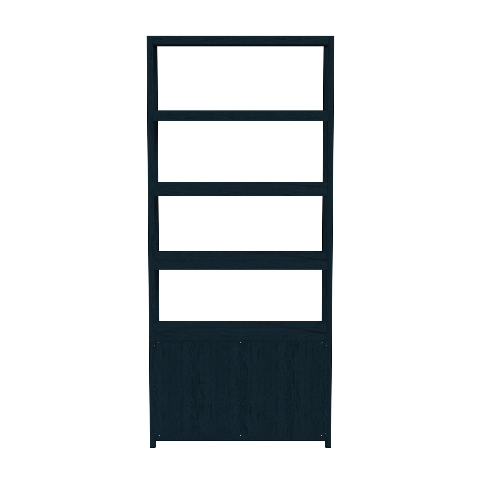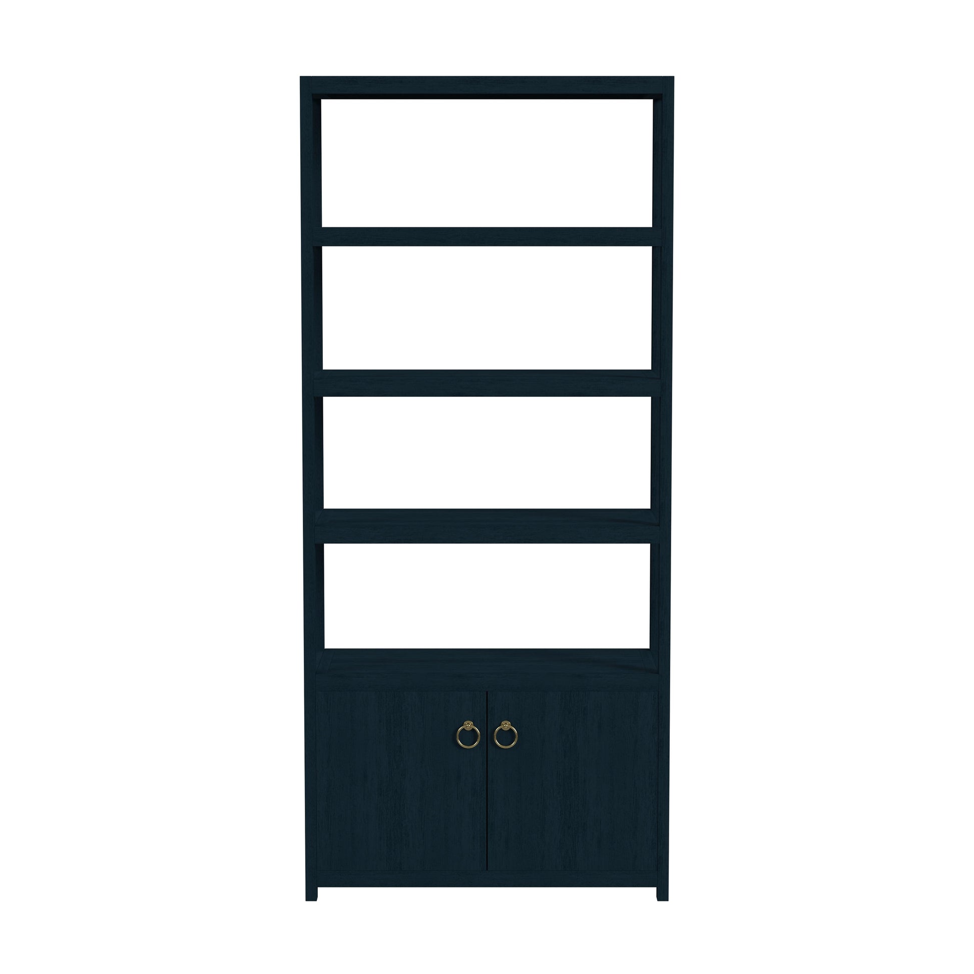 The Lark 4-Tier Etagere Bookshelf offers multiple storage solutions for open display and hidden storage. The gorgeous gold ring pull hardware gives a modern look while the textured navy finish brings a coastal touch to your living room or office space. Dimensions: 32"W x 14"D x 72"H