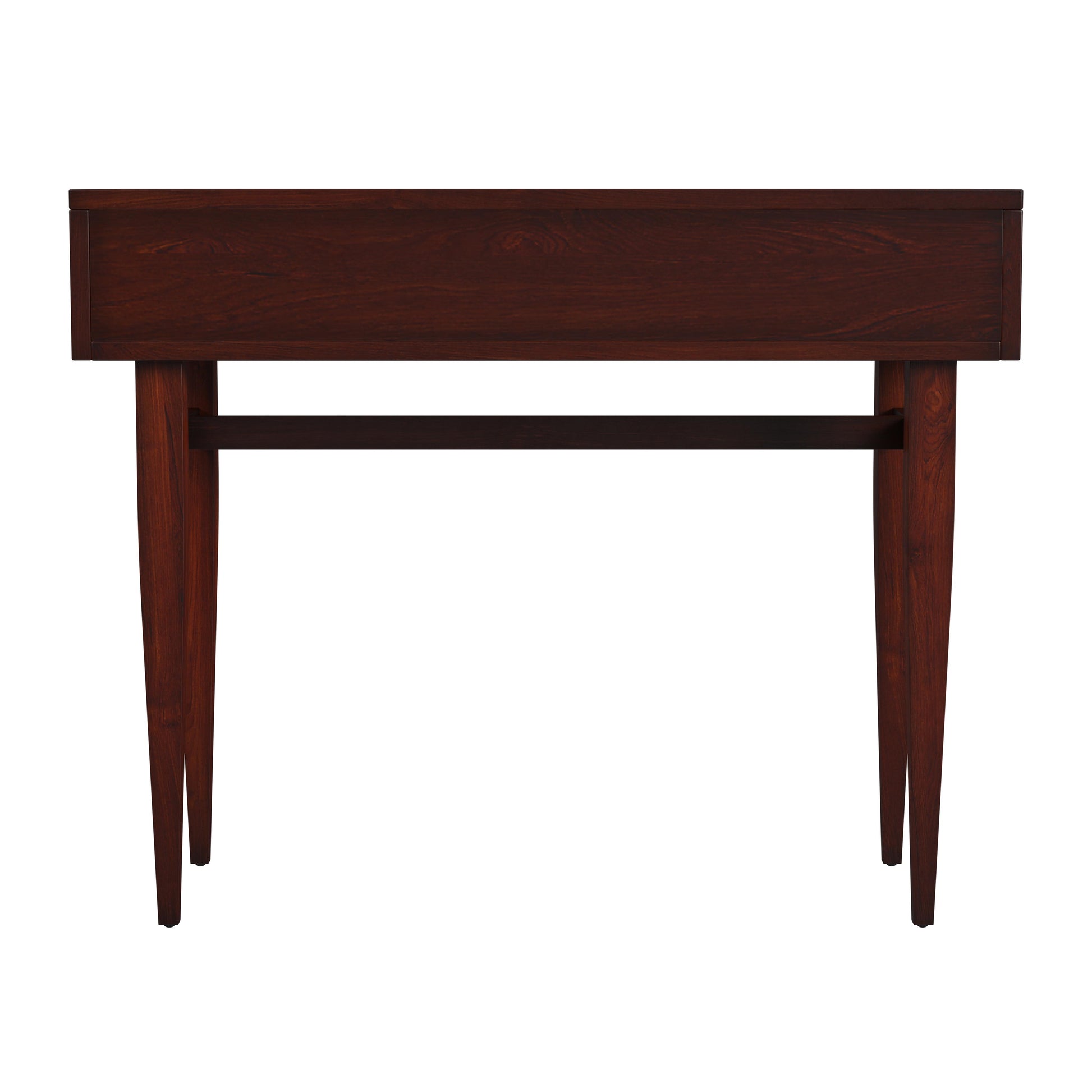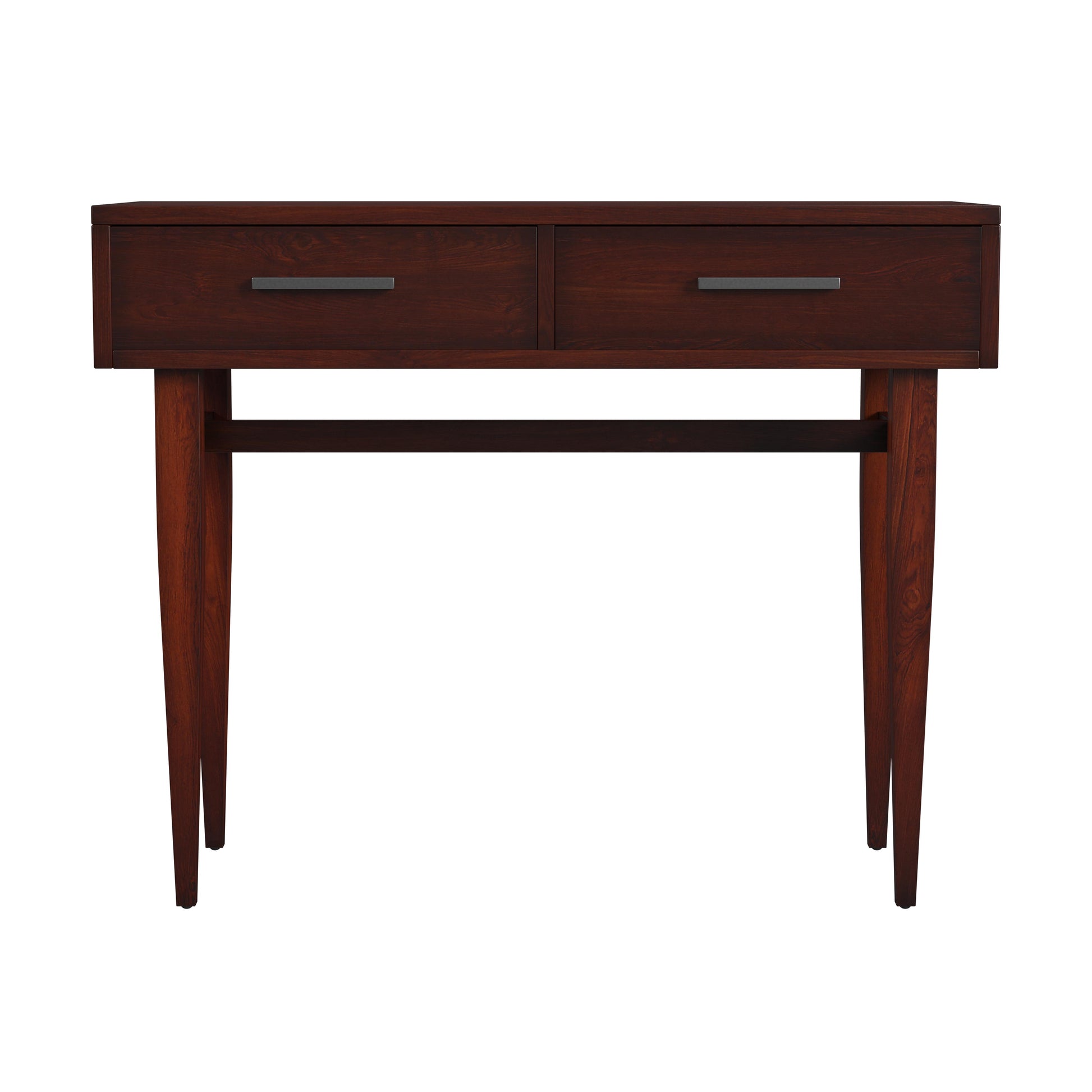 Lavery 40" Console Table with Storage in Dark Brown 9388024 Midcentury modern design is widely popular, and this vintage console table evokes the imagination and simplicity of the period. Architectural notes are readily apparent with the table top supported by four sleekly tapered legs conjoined by a Wood trestle base. Expertly crafted from rubberWood solids and engineered Wood, the sengon tekik veneers are highlighted by a cherry finish to accentuate the Wood grain. Combining function to go with its unique form, the table features two smooth-opening drawers with black finished aluminum pulls. Two drawers with ball bearing metal glides – fully extendable Inside drawer dimensions: 16.75"W x 11.75" D x 3.75" H Four sided taper legs Solid rubberwood legs and veneer top over engineered wood Dimensions: 40"W x 16.25"D x 32"H