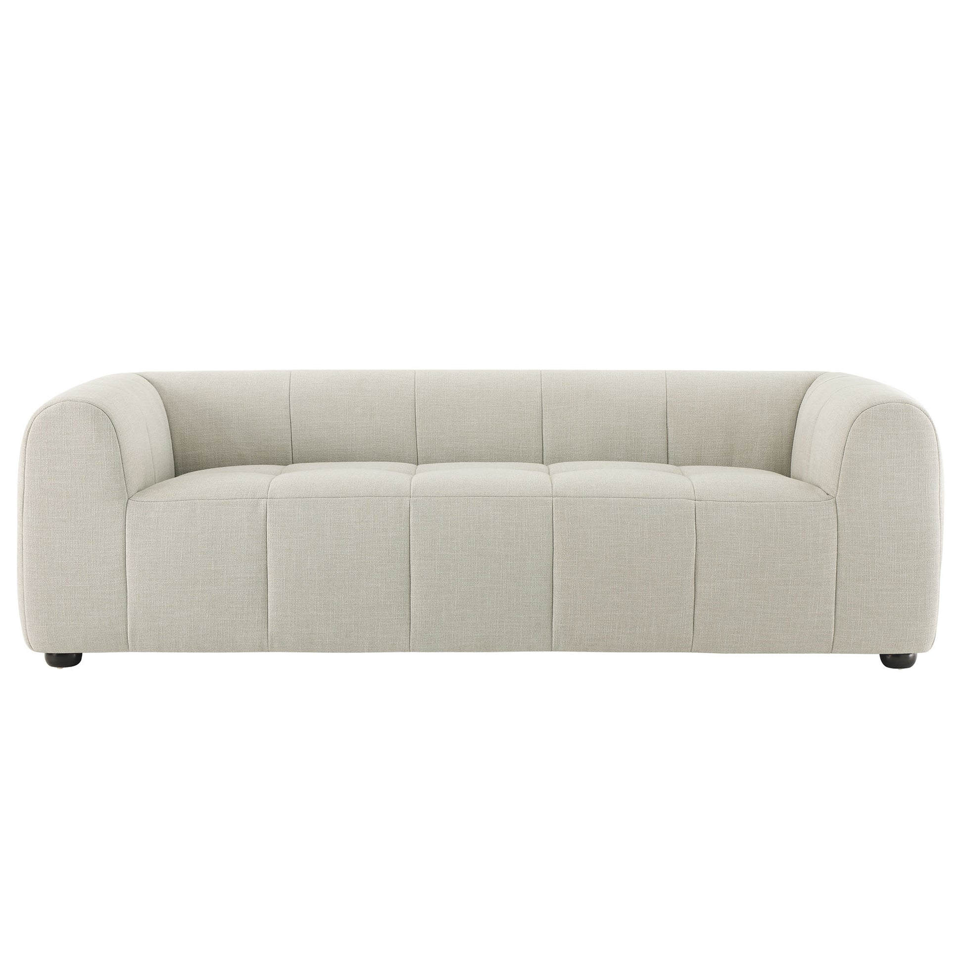 Step into the world of refined relaxation with this Upholstered Fabric Sofa, a stylish centerpiece that seamlessly combines comfort with a chic, casual aesthetic. Embodying a retro-modern look, this 3 Seater Sofa features dense foam padding encased in soft fabric upholstery, perfect for sinking into after a long day. The allure of this elegant piece is enhanced by subtly tufted seats that blend with a neatly stitched grid pattern, extending into gently curved armrests and backrests, imparting a touch of geometric flair.