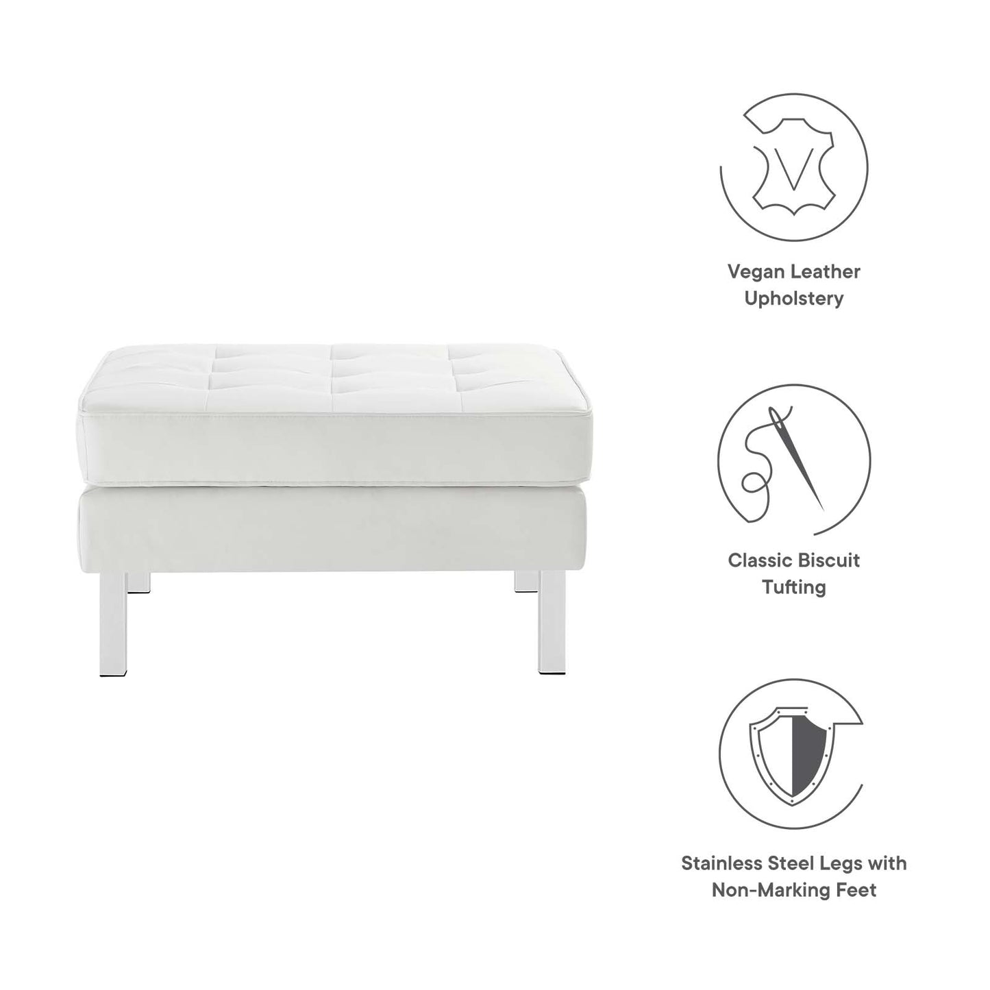 Revolutionize your living room furniture with the iconic Loft Vegan Leather Ottoman. Adding visual depth to your living room or lounge space, Loft features soft and durable vegan leather upholstery accented with classic biscuit tufting. This modern ottoman showcases a captivating linear design, tubular stainless steel legs, and non-marking foot caps that protect flooring. Inspired by the richness of mid-century modern style, this upholstered ottoman is an ideal choice for living rooms, office reception areas, and lounge spaces. Ottoman Weight Capacity: 330 lbs.