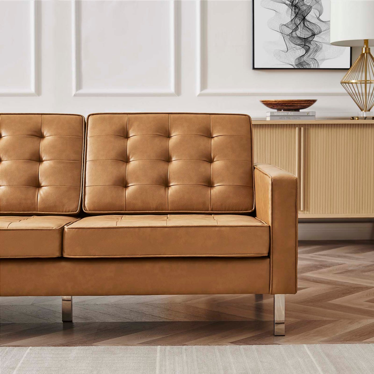 Transform your living space with the stunning Loft Tufted Vegan Leather Sofa and Ottoman Set, an embodiment of modern elegance and comfort. Crafted with soft, durable vegan leather upholstery and featuring classic biscuit tufting, this furniture set adds visual depth and sophistication to any living room, lounge, or office reception area. The captivating linear design, complemented by robust tubular stainless steel legs and non-marking foot caps, ensures both style and functionality while protecting your flooring.
