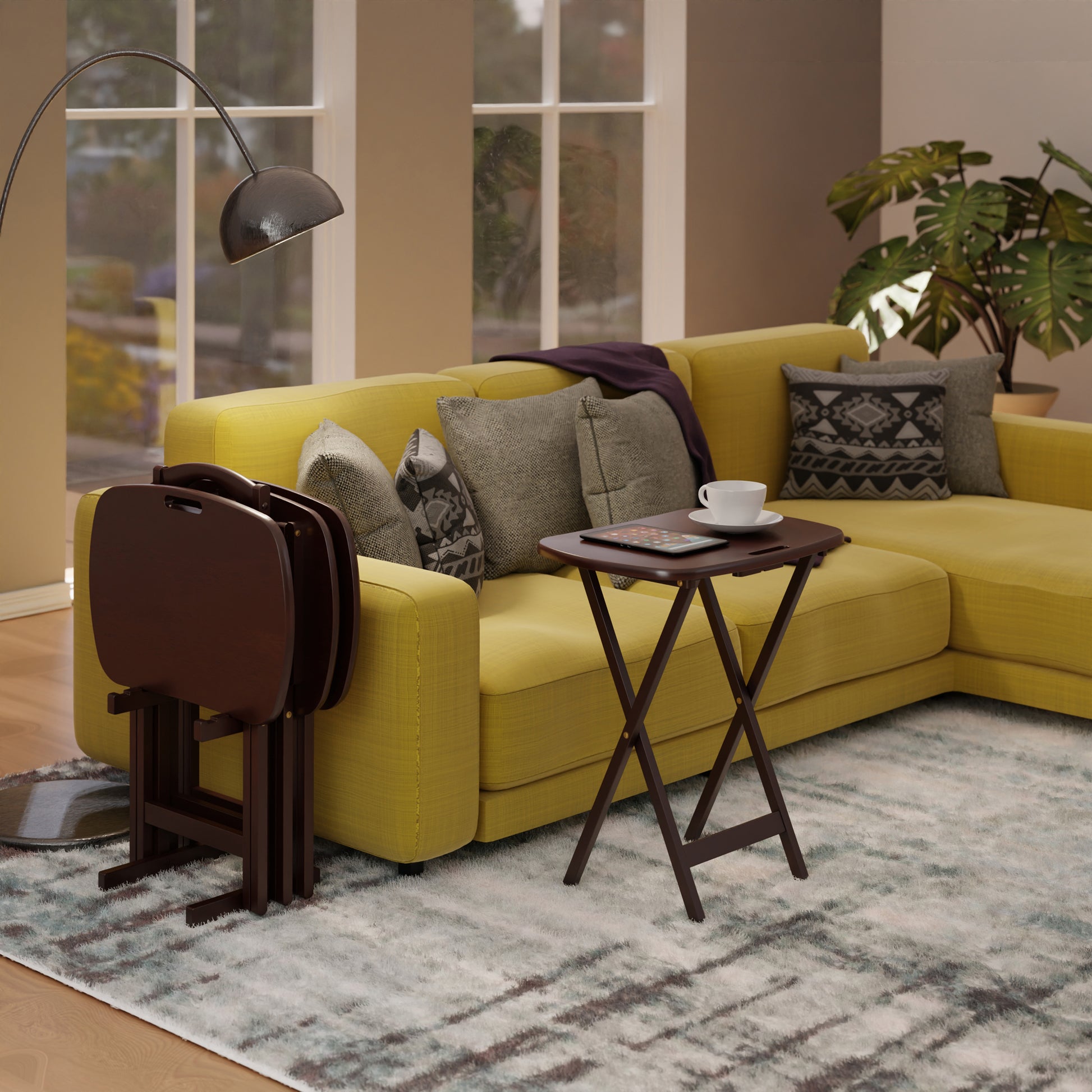 Make entertaining simple and easy with the Winsome Wood Lucca 5-Piece TV Table Set. A perfect companion piece for a casual meal in front of the TV or on the patio. Four folding snack tables great for daily use and compact enough to store in the closet. An upright stand is an innovative addition to this set as it serves as a rack to store the folded tables discretely when not in use. These beautifully finished trays are convenient and make meal serving simple when you need it. The wide 22.8” oblong portable folding TV table set provides users easy handling so they can lift the trays off the stand using the cutout handles in the table. You can move them closer to a sofa, chair or even into a different room. Winsome TV tables are ideal for small apartments, dorms and offices. They can also be used to prop up a laptop, play cards or other board games, apply nail polish or sort coupons. These light weight tables are portable and practical, fold up and place back on the stand for compact storage. Notches on the stand keep the folded tables securely in place. With its many uses and advantages, the Lucca 5-Piece TV Table Set is a piece of furniture you'll appreciate and be glad you own. Constructed of solid and composite wood in a warm walnut. Conveniently packed and shipped in 1 box, that includes the hardware necessary for assembling the stand. Tables arrive ready to use and require no assembly. Replacement part request can be submitted directly to the manufacturer within 60 days from date of purchase.