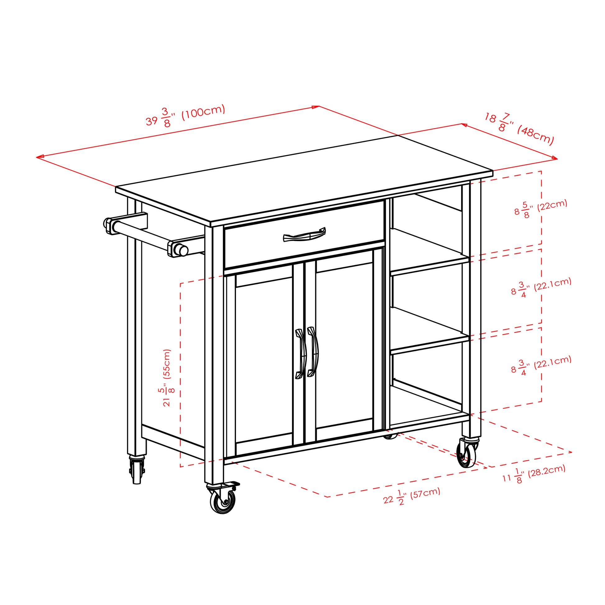 Bring polish and function into your kitchen or patio with the two-toned Marissa Kitchen Cart. The natural wood top is a lovely contrast with the darker walnut-finished cabinet. Traditional piece with modern, brushed silver handles for the drawer and doors alike. The cart top provides a wide workspace, with plenty of storage opportunities below. Keep your silverware and smaller must have accessories, accessible in the drawer. Keep dishes, glassware, and plates on the three shelves on the side which are removable for storing taller items like your cook books you may want to display. Open up the two doors to the cabinet for additional storage space for bowls, canisters, cooking oil and other pantry items. The cabinet shelf can also be removed if needed for larger kitchen gadgets. The convenient wooden push handle is designed to take a roll of paper towels or can be used for hanging kitchen towels. Keep the cart in one place or roll it out to the dining room and use as a serving cart when guests are over. Four Rolling casters, two of which lock to keep the unit stable while in use, allow for easily mobility when needing to move or take into another room. Made of solid and composite wood. Conveniently packed and shipped in 1 box that includes the hardware necessary for assembling. Replacement parts can be requested directly to the manufacturer within 60 days from date of purchase.