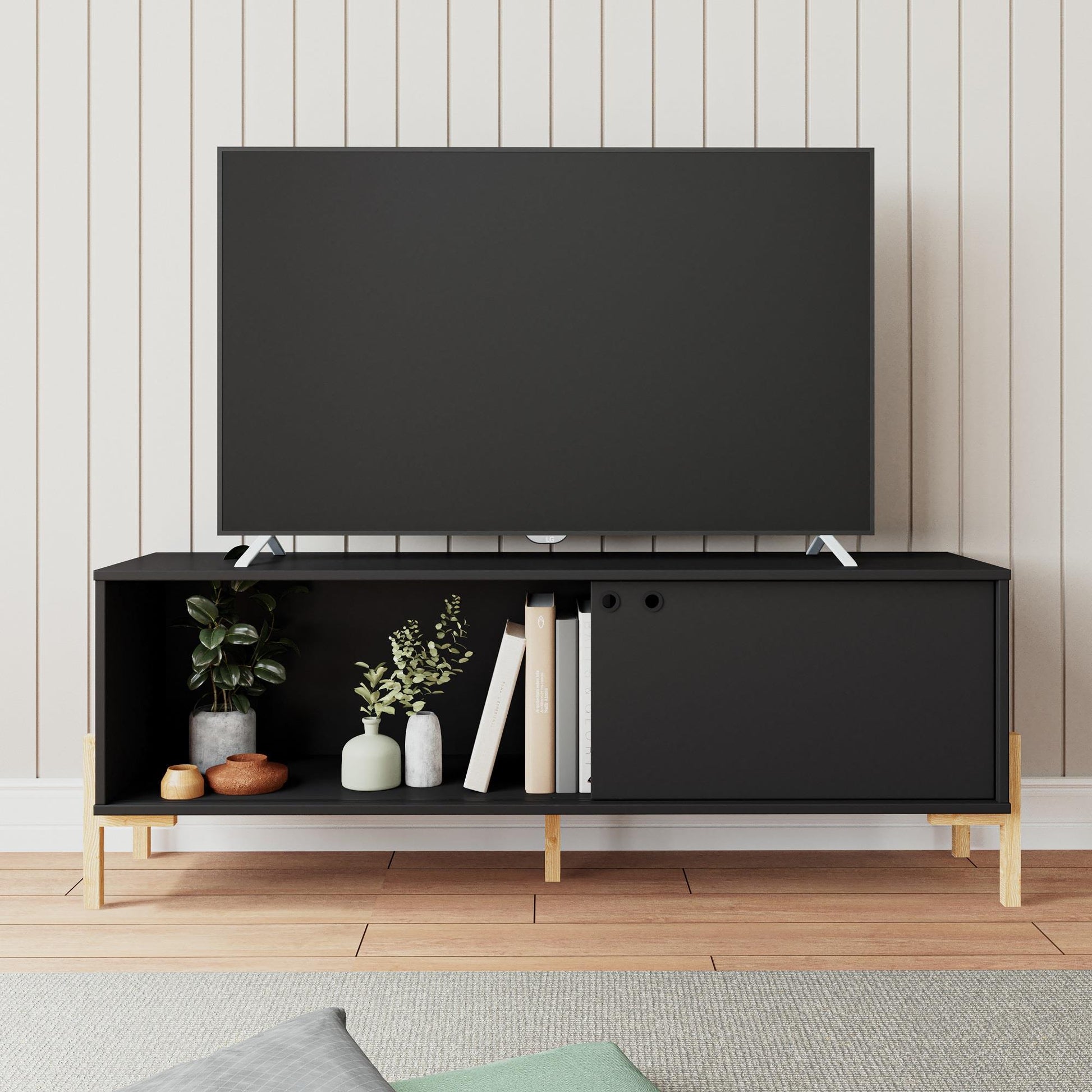 Elevate your living space with this stylish TV stand that embodies classic Mid-Century design. Featuring a streamlined silhouette and beautiful oak legs, this versatile piece seamlessly blends functionality with understated elegance. The ample lower storage space, cleverly concealed with a sliding closure, is ideal for housing media players, electronic accessories, books, and more, keeping your living area organized and clutter-free.