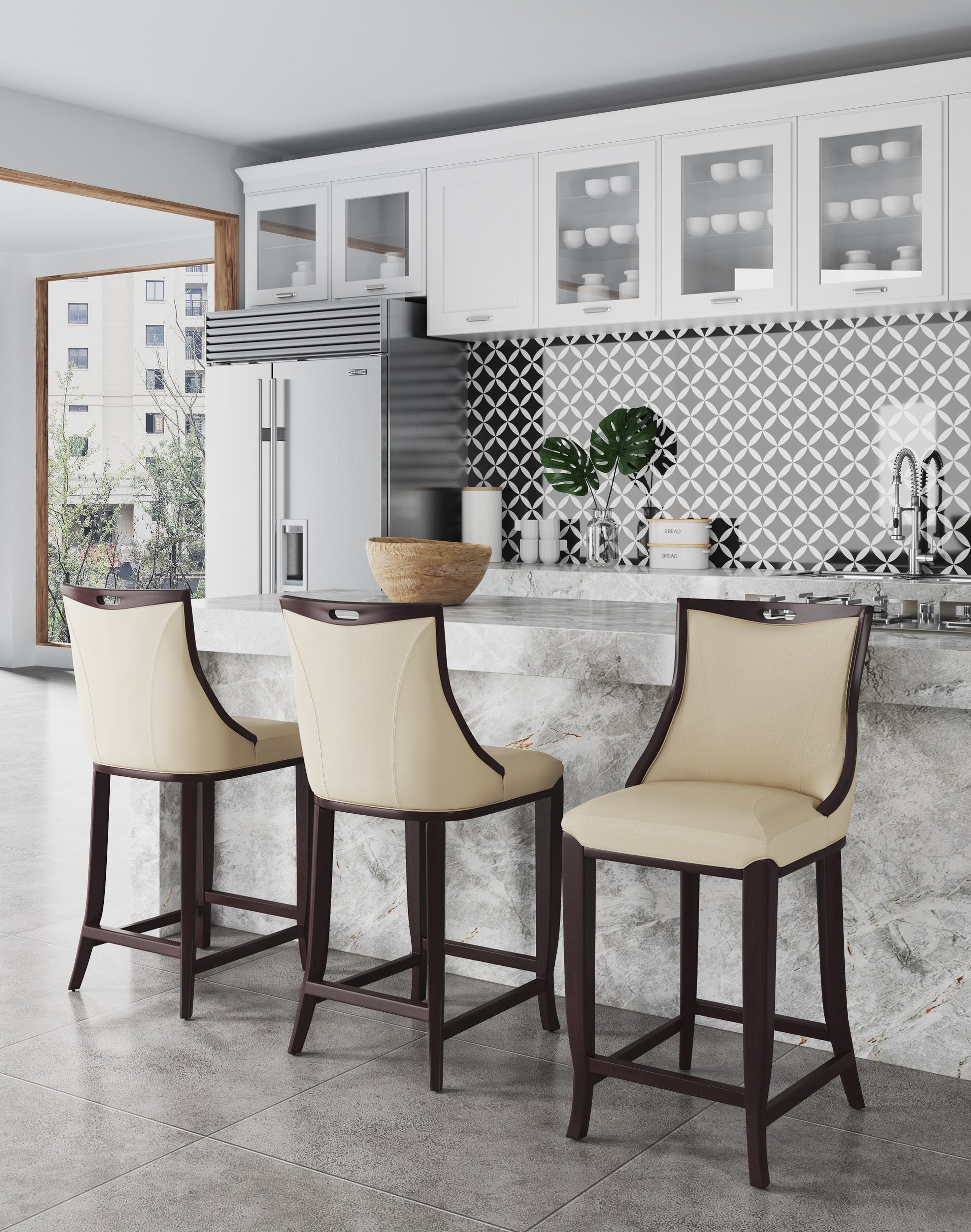 Elevate your dining experience with this stunning bar stool, a perfect blend of elegance and functionality. Designed with a subtle hourglass silhouette, this stool showcases refined curves that bring a sophisticated touch to any space. The rich walnut-finished wood frame offers a classic yet modern aesthetic, making it an eye-catching addition to your home decor.
