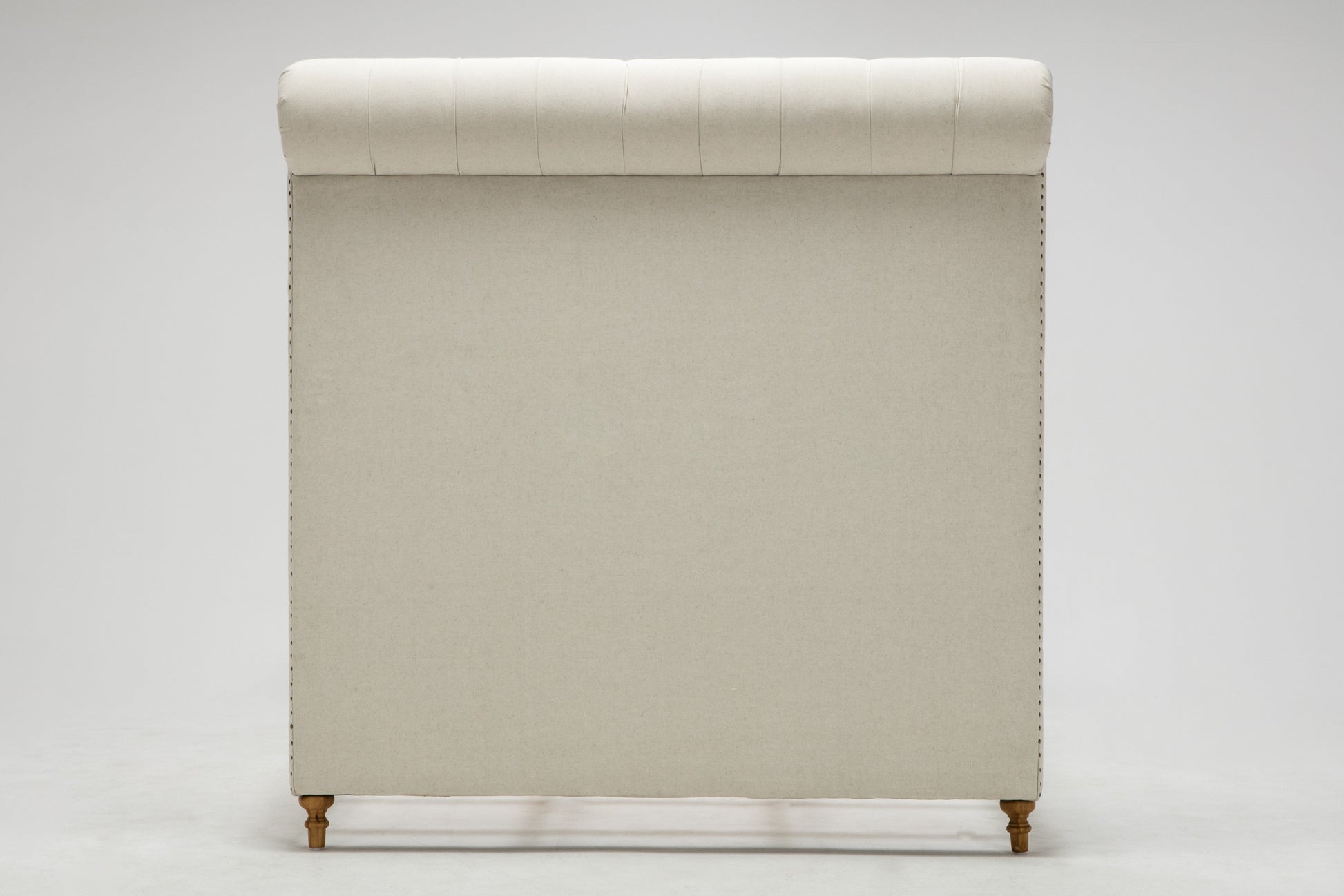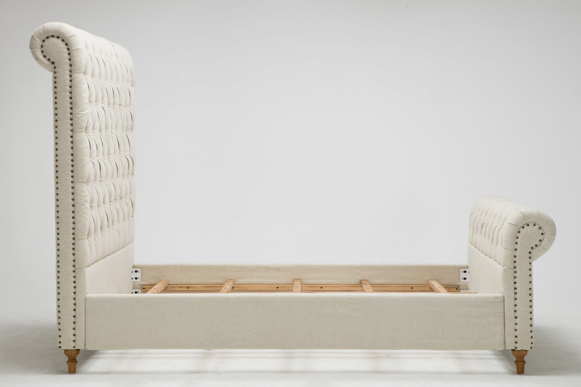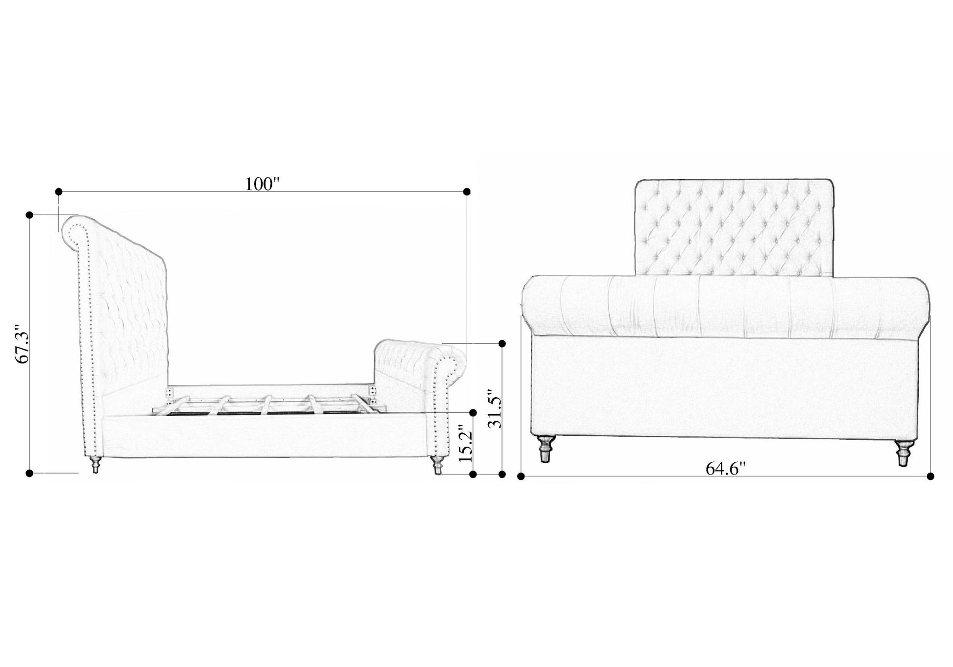 The ultimate retreat. Get the best night’s sleep with this plush bed frame. Fully cushioned and upholstered, its classic allover button tufting looks luxuriously inviting. Clean lines and neutral colors keep it elegant. The ultra-high headboard and rolled edges create a dramatic profile, turning your bed into a soft sanctuary you can’t wait to sink into. For complete comfort, try accenting with the Chateau Modern Tufted Sofa or Loveseat. Dimensions: 64.6 in. Length, 67.3 in. Height, 100 in. Depth.