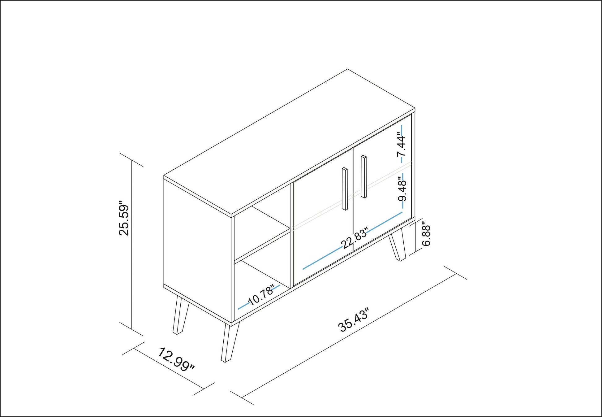 Become the entertainer you always wanted to be with the Amsterdam sideboard. With open shelving perfect for wine glasses, dishes, books, and favorite travel trinkets, and ample display space for platters and snacks, this sideboard is functional and will always remain a mainstay for your dining or living space. Two doors conceal a pair of shelves that work well for storing dinner party essentials and tucking away items when the event is over. Splayed legs and long handles keep this piece modern and sophisticated, and blending easily with any existing decor. Dimensions: 35.43 in. Length, 25.59 in. Height, 13 in. Depth.