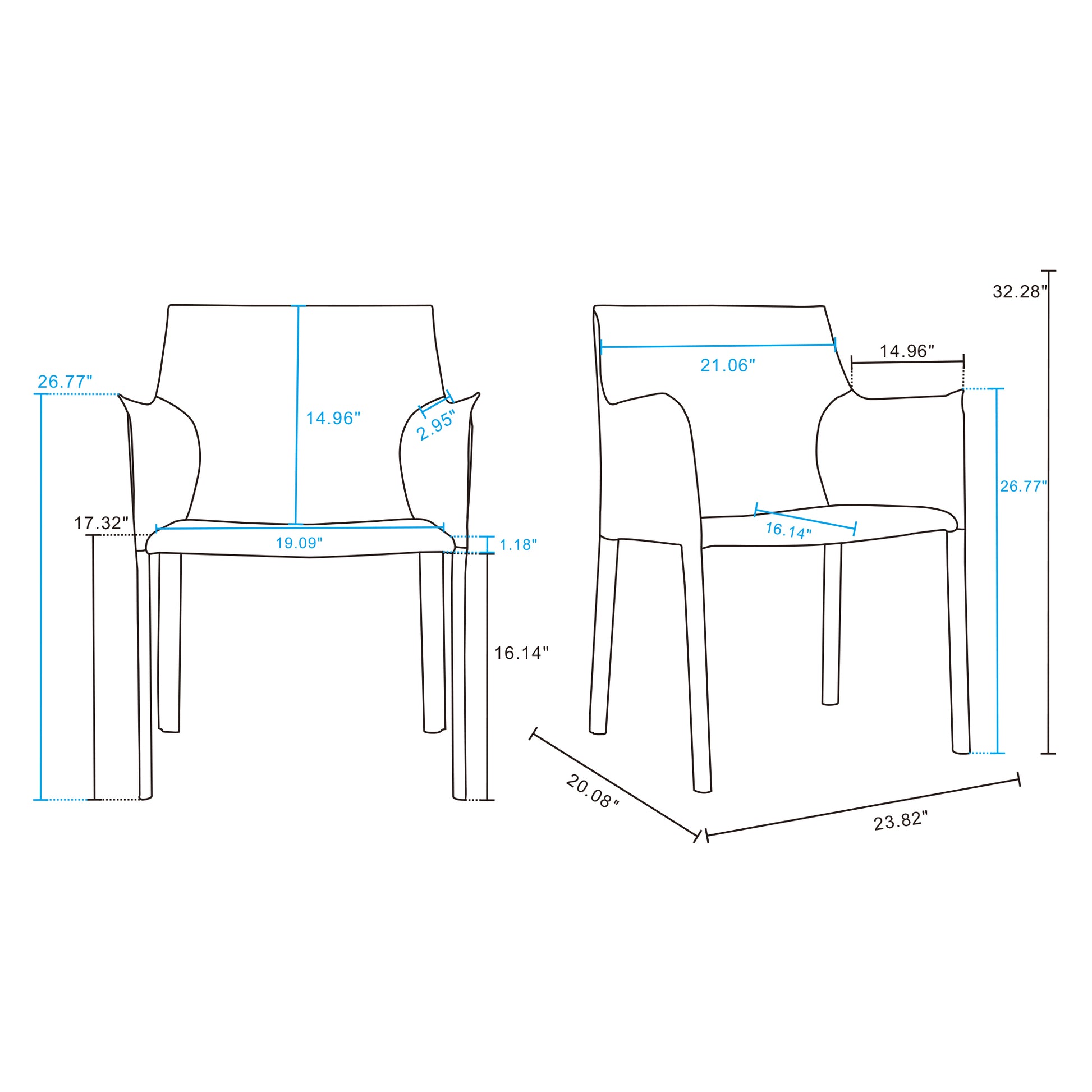 An elegant twist to a classic design. The Lachesis dining chair is a welcoming modern arm chair with a curved shape that makes it particularly comfortable. The chair is entirely covered in leather, offering a sleek well tailored appeal. Cleverly constructed to fit any home's decor from industrial and coastal, to glam and boho chic. Dimensions: 21.65 in. Length, 32.68 in. Height, 25.2 in. Depth.