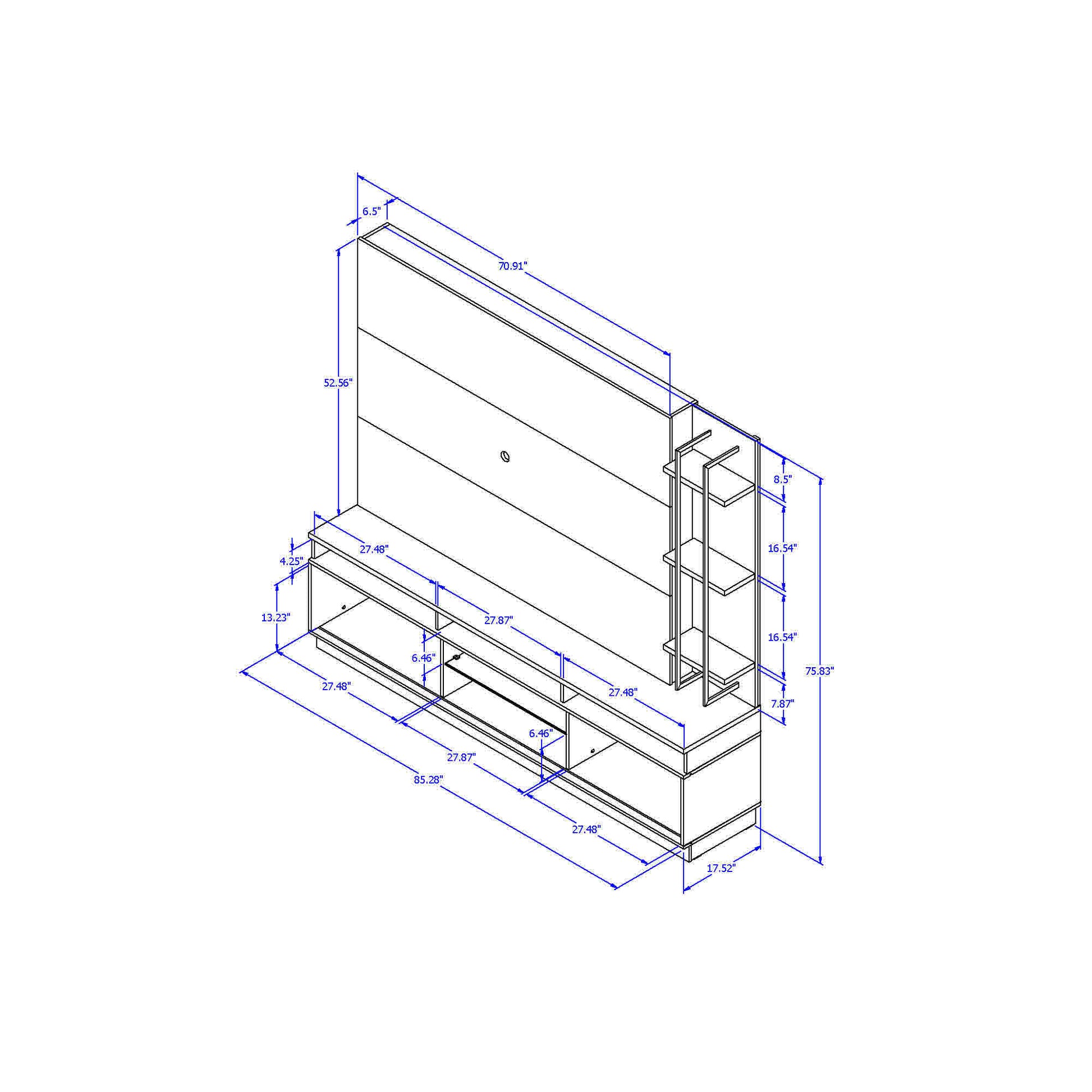 If you take home entertaining seriously, the Pomander Entertainment Center is perfect for you. This expertly crafted stand gives the illusion of a floating TV mount, with an attached high back, to mount your tv, as well as three shelves for décor or added media storage... That means no drilling into the walls, no installation! The contemporary modern base features two ribbed, sliding doors and a center tempered glass shelf that divides two large compartments. With a chic modern look, ample storage, and eye-catching design, the Pomander will exceed all your movie night needs! Dimensions: 85.27 in. Length, 75.78 in. Height, 17.63 in. Depth.