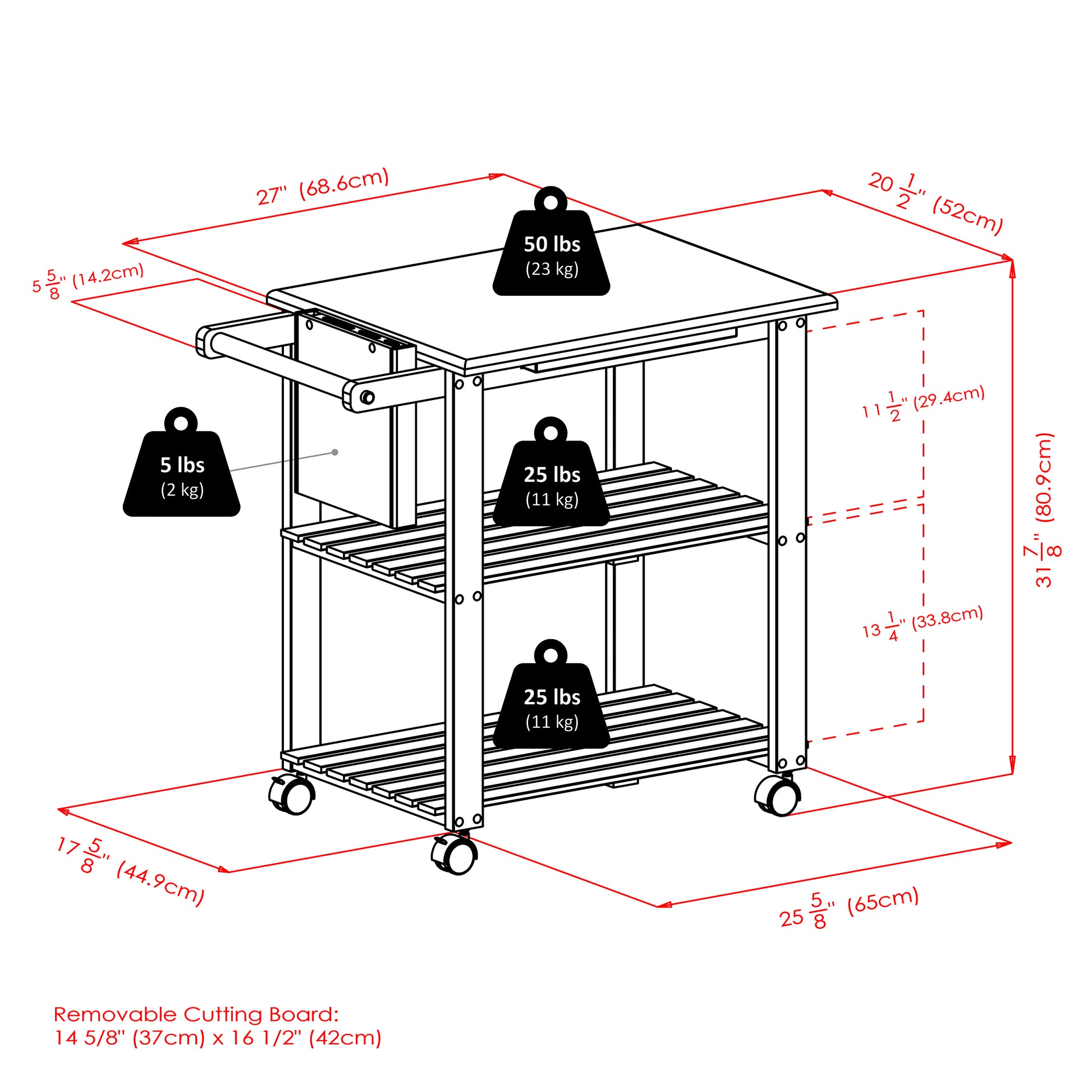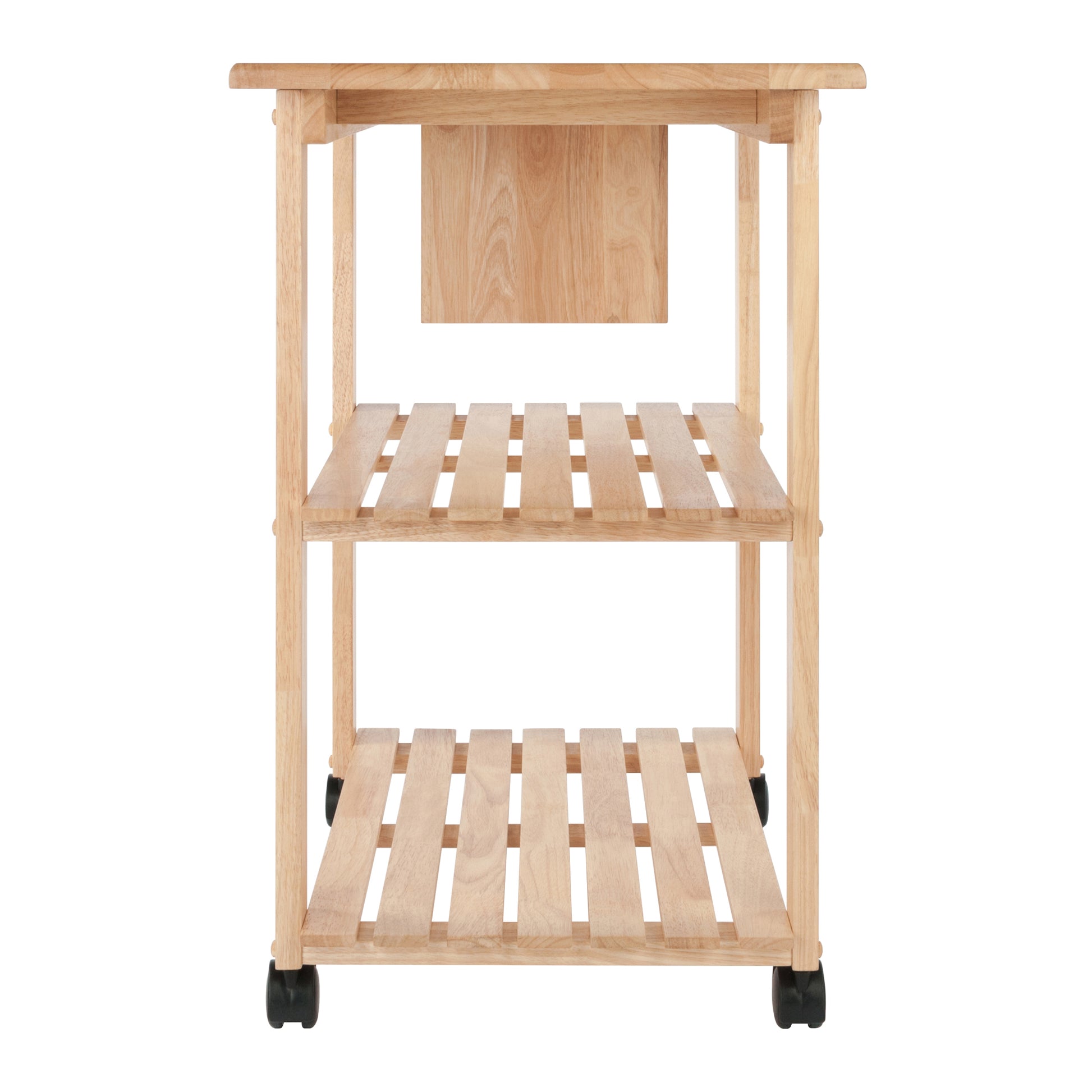 Add a traditional touch to your kitchen, with the simplicity and function of the Winsome Wood Mario Utility Kitchen Cart. This cart is a must have for small spaces that need versatility, providing storage for dishware and knives and also functions as a workable surface. Handsome and durable, the cart is the perfect food prep station. Featuring a pull-out cutting board and a four knife holder attached on the side, must have for small kitchen. The convenient wooden push handle was design to be used for hanging kitchen towels as well. Two slatted shelves are ideal for kitchen serve-ware, mixing bowls, and more. Keep the cart in one place or roll it out to the dining room and use as a serving cart when guests are over. Four Rolling casters, two of which lock to keep the unit stable while in use, allow for easily mobility when needing to move. Constructed of study solid and composite wood in a natural finish that will allow this cart to mesh well with most kitchen decor. Conveniently packed and shipped in 1 box, that includes the hardware necessary for assembling. Replacement part request can be submitted directly to the manufacturer within 60 days from date of purchase.Dimensions : 33.7 in. Wide 20.47 in. Deep 31.85 in. High
