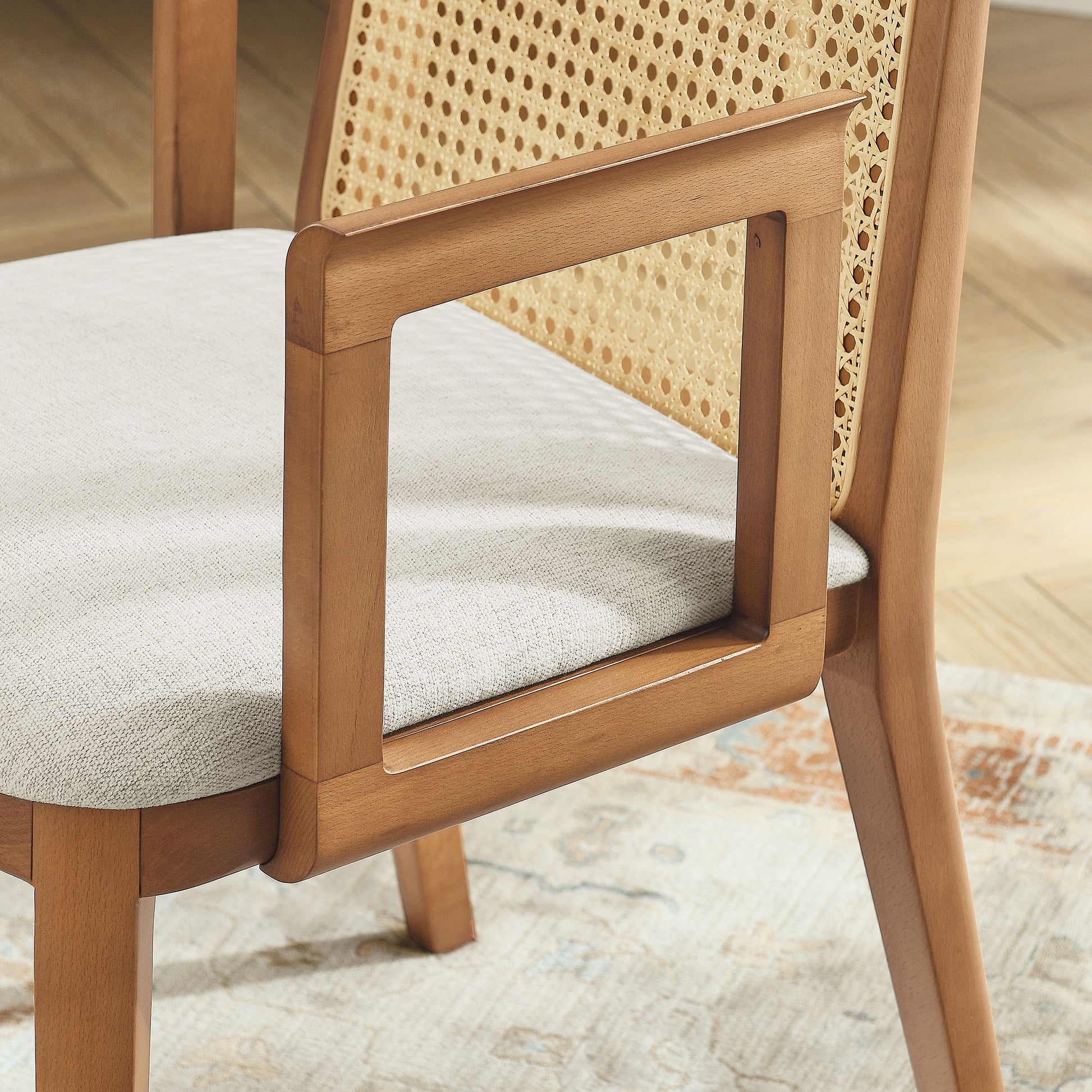 Elevate your dining space with a stunning blend of French country elegance and modern farmhouse style. This exquisite armchair features a sturdy beech wood frame complemented by a rattan backrest with intricate cane webbing, ensuring both style and durability. The dense foam padded seat, covered in soft fabric upholstery, offers lasting comfort, making it an ideal choice for extended dining experiences.