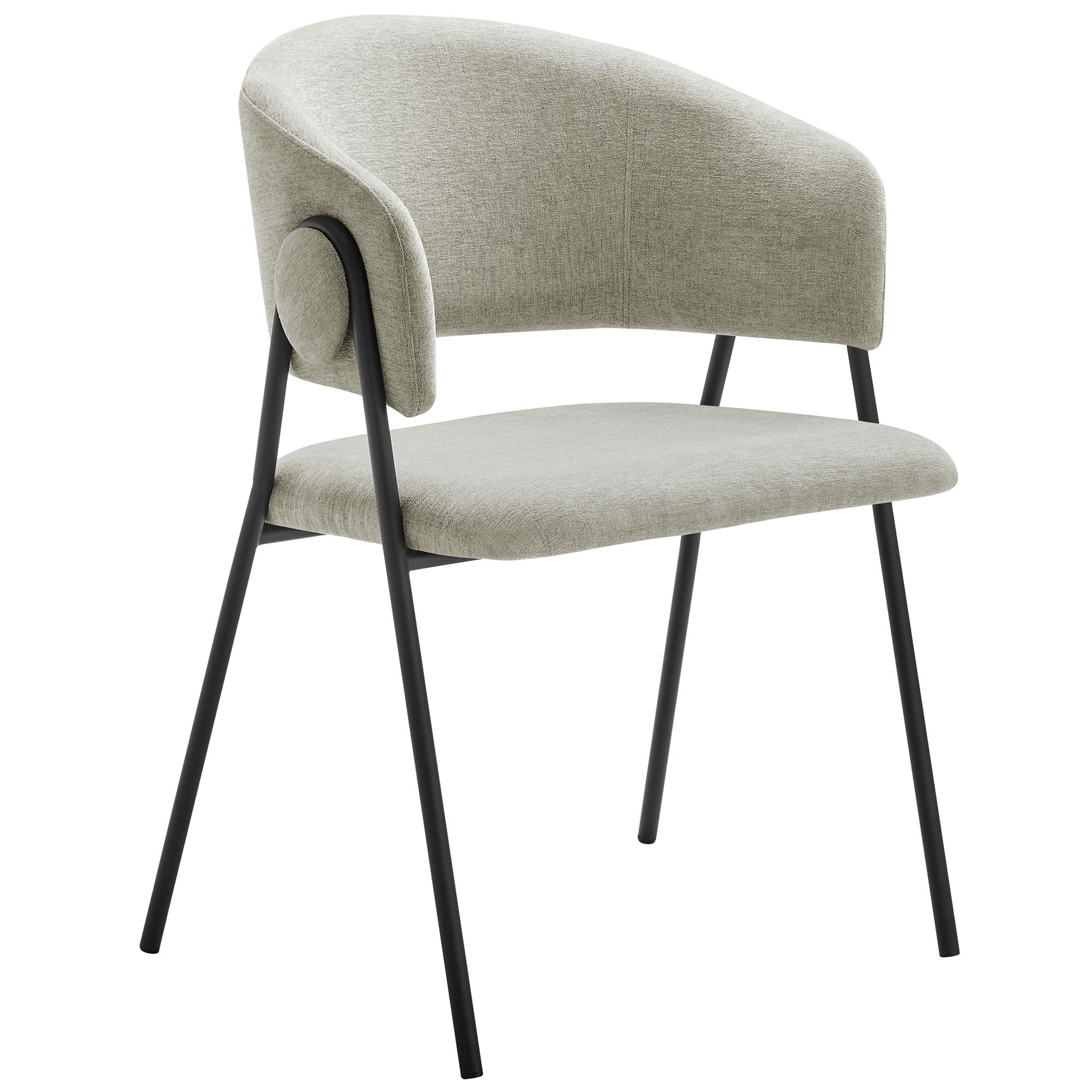 Introducing a stunning set of dining room accent chairs that effortlessly blend vintage charm with versatile functionality. Each chair is elegantly upholstered in your choice of luxurious heathered chenille or stain-resistant performance velvet, featuring a stylish gap between the seat and backrest that shapes the elegant contour of an open back armchair. This set of two barrel dining chairs stands on splayed metal legs that gracefully ascend and curve around a decorative round button, enhancing the retro aesthetic of these club chairs.